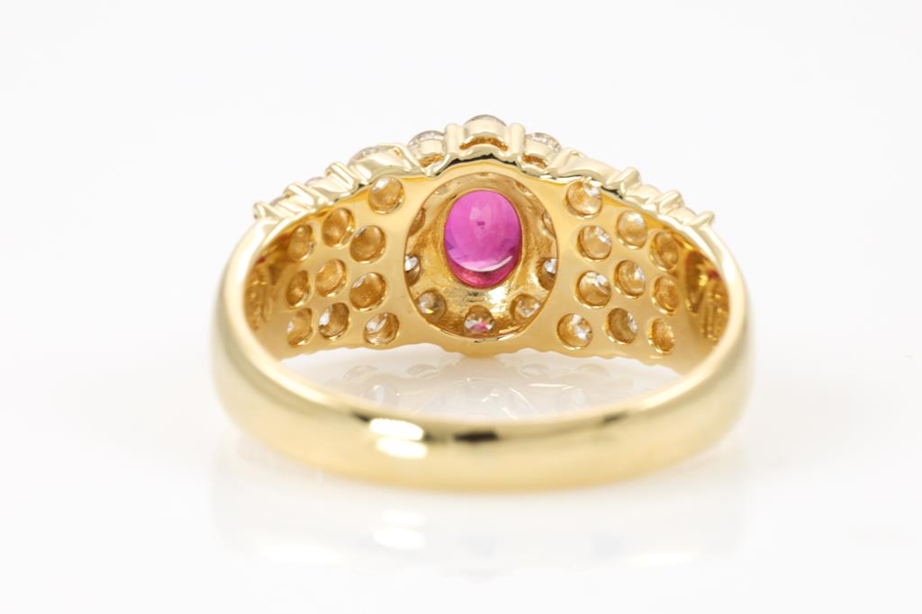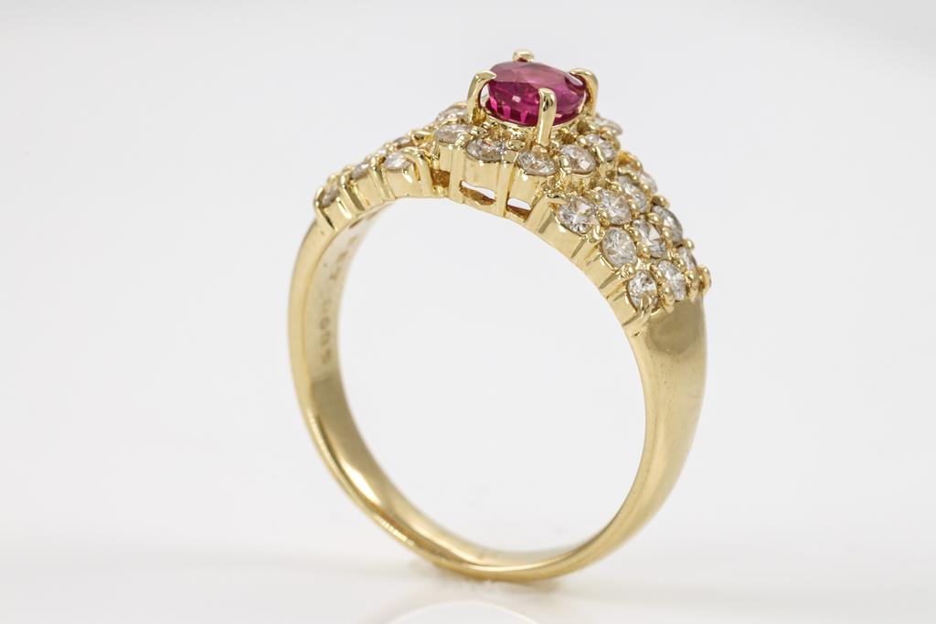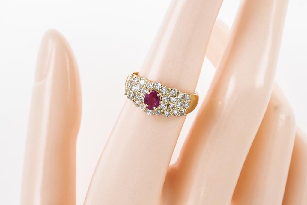 Ruby and Diamond ring with centre oval cut Ruby of 0.57cts and round Diamonds totalling 0.85cts (Estimated grading: G-H SI). 18ct yellow gold. Ring size: N - can be resized up by a maximum of 3 sizes, down with ring clip. Weight: 5.9g. (Pre-owned)