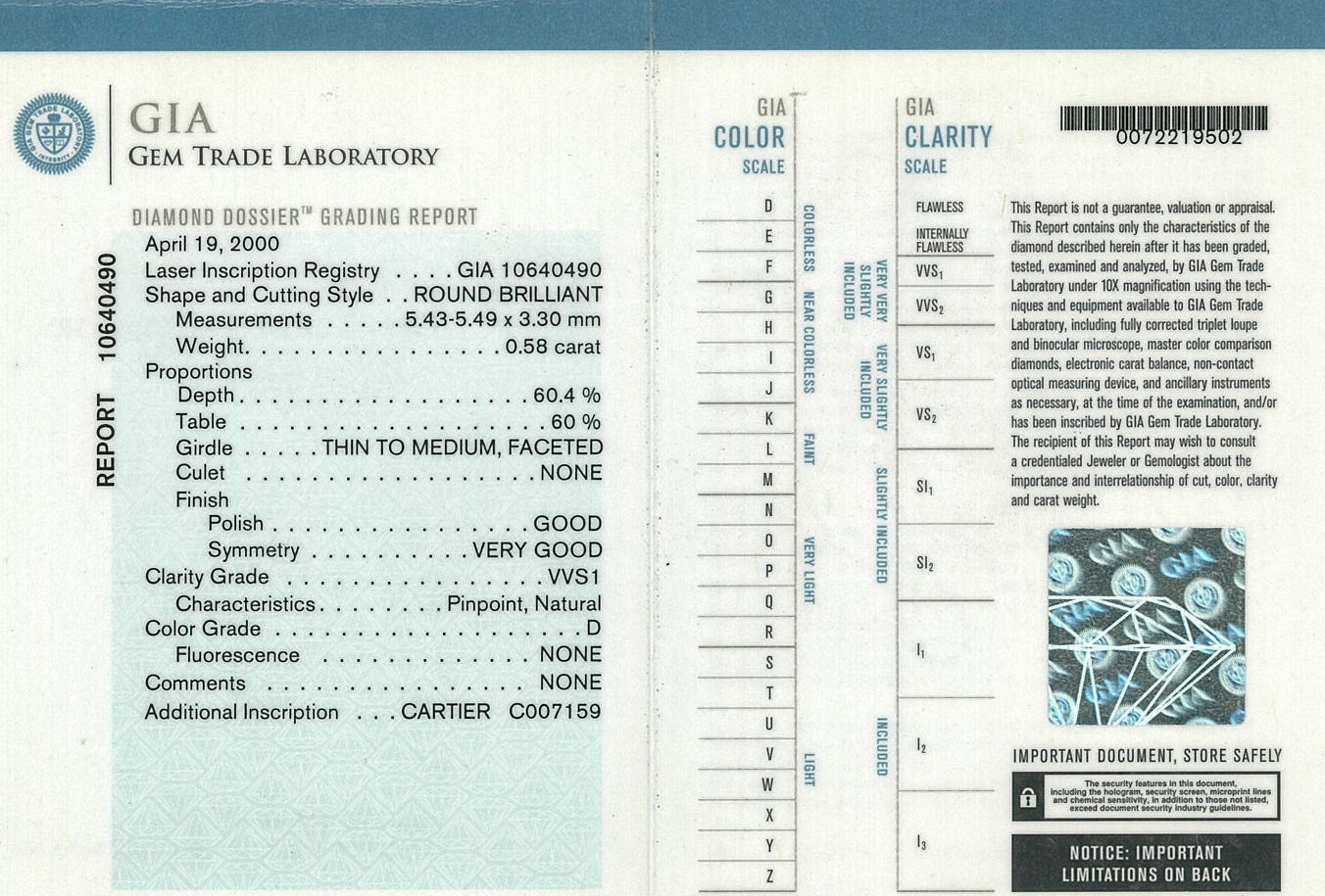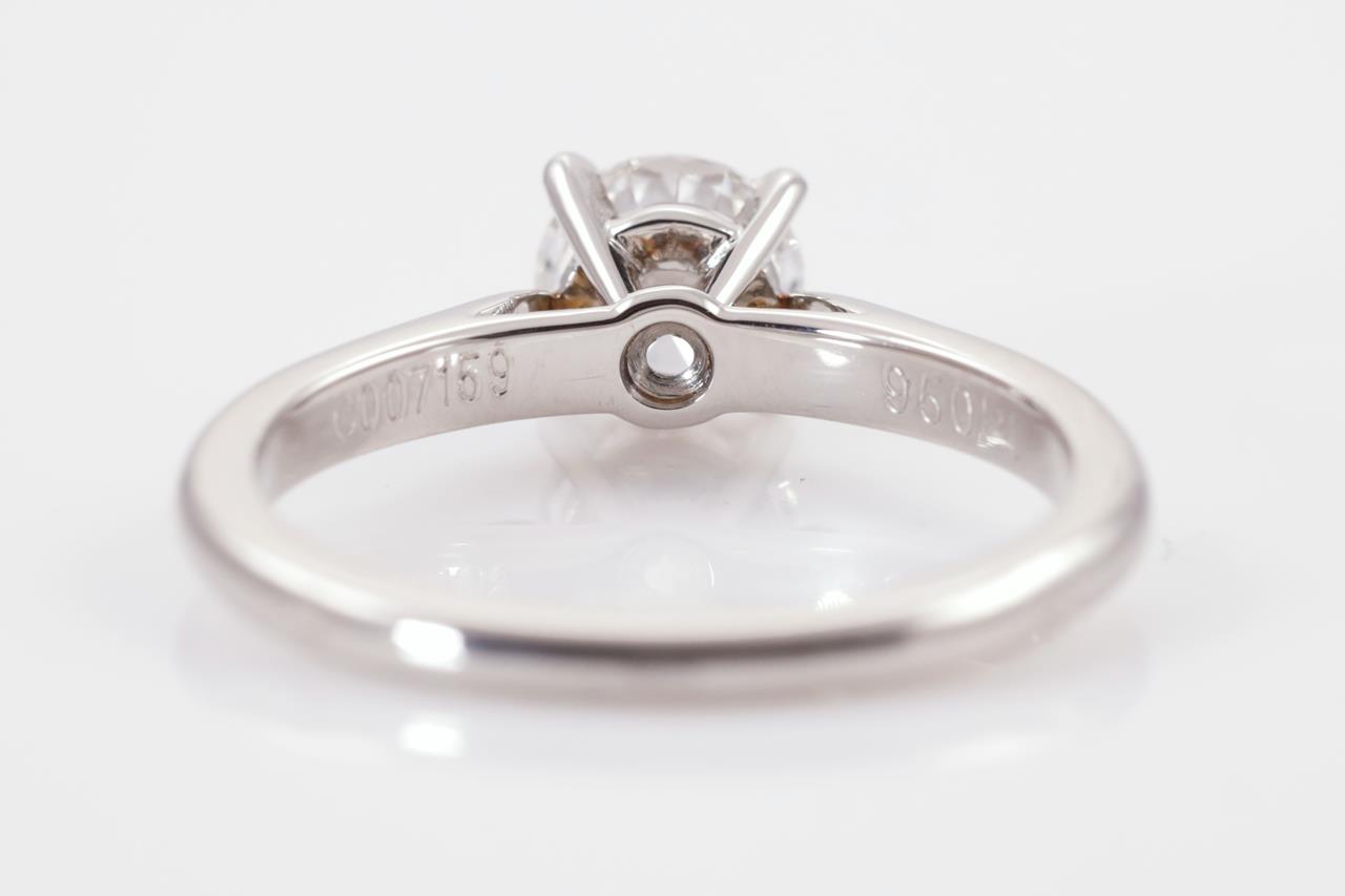 Cartier 1895 Diamond solitaire ring with a round brilliant cut Diamond of 0.58ct (With GIA summary report graded as D VVS1 #10640490). Cartier stamped size 49, I1/2 - ring resizing is not recommended. Platinum. Weight: 3.5g. With Cartier certificate dated 01/05/2001. With Cartier box. (Pre-owned)