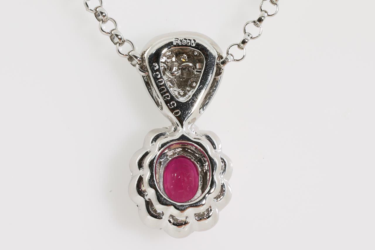 Ruby and Diamond pendant with round shape Ruby of 0.58ct and Diamonds totalling 0.66cts (Estimated grading: G VS-SI). Platinum with platinum 44cm chain. Weight: 7.3g (Pre-owmed)