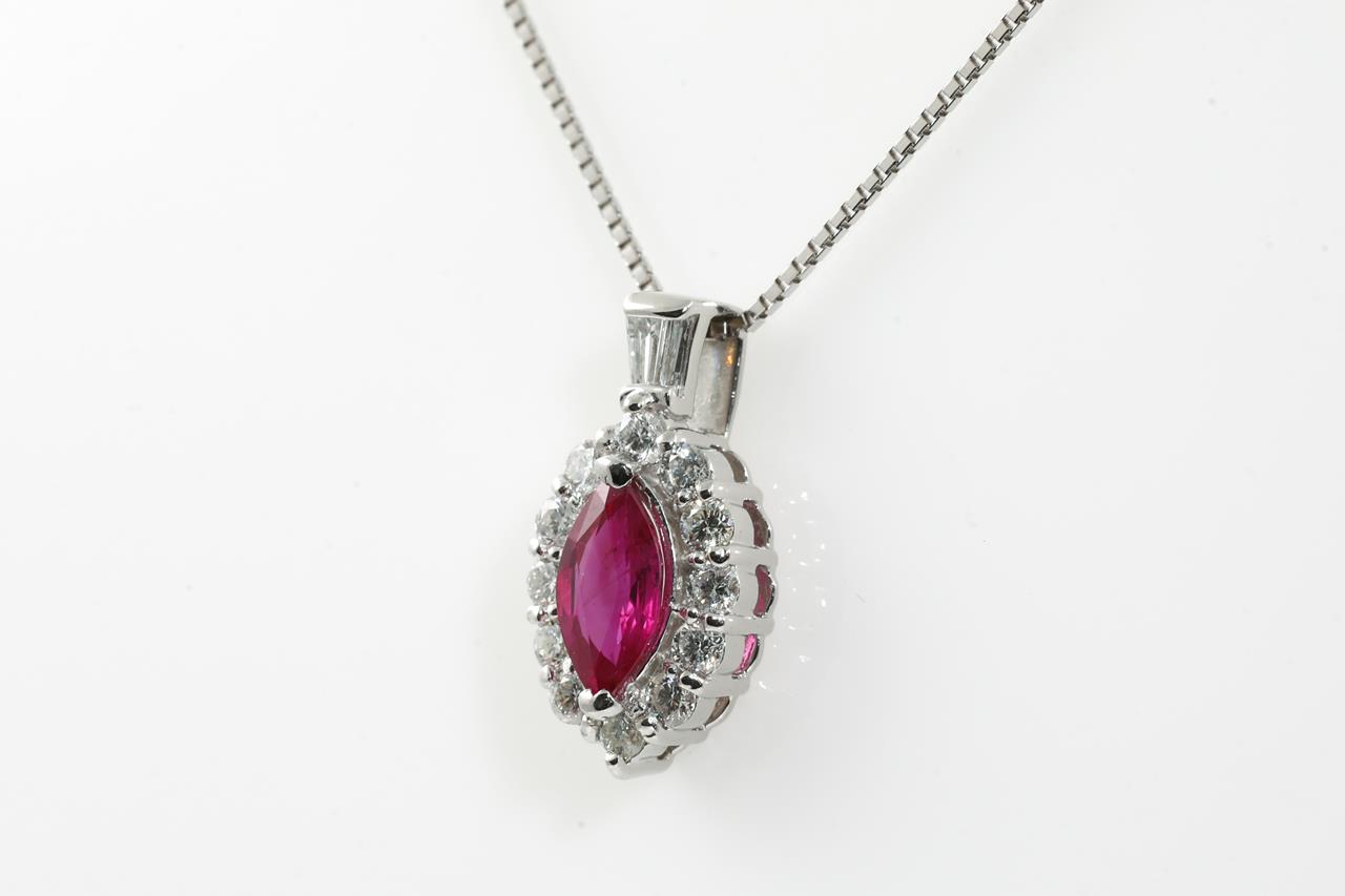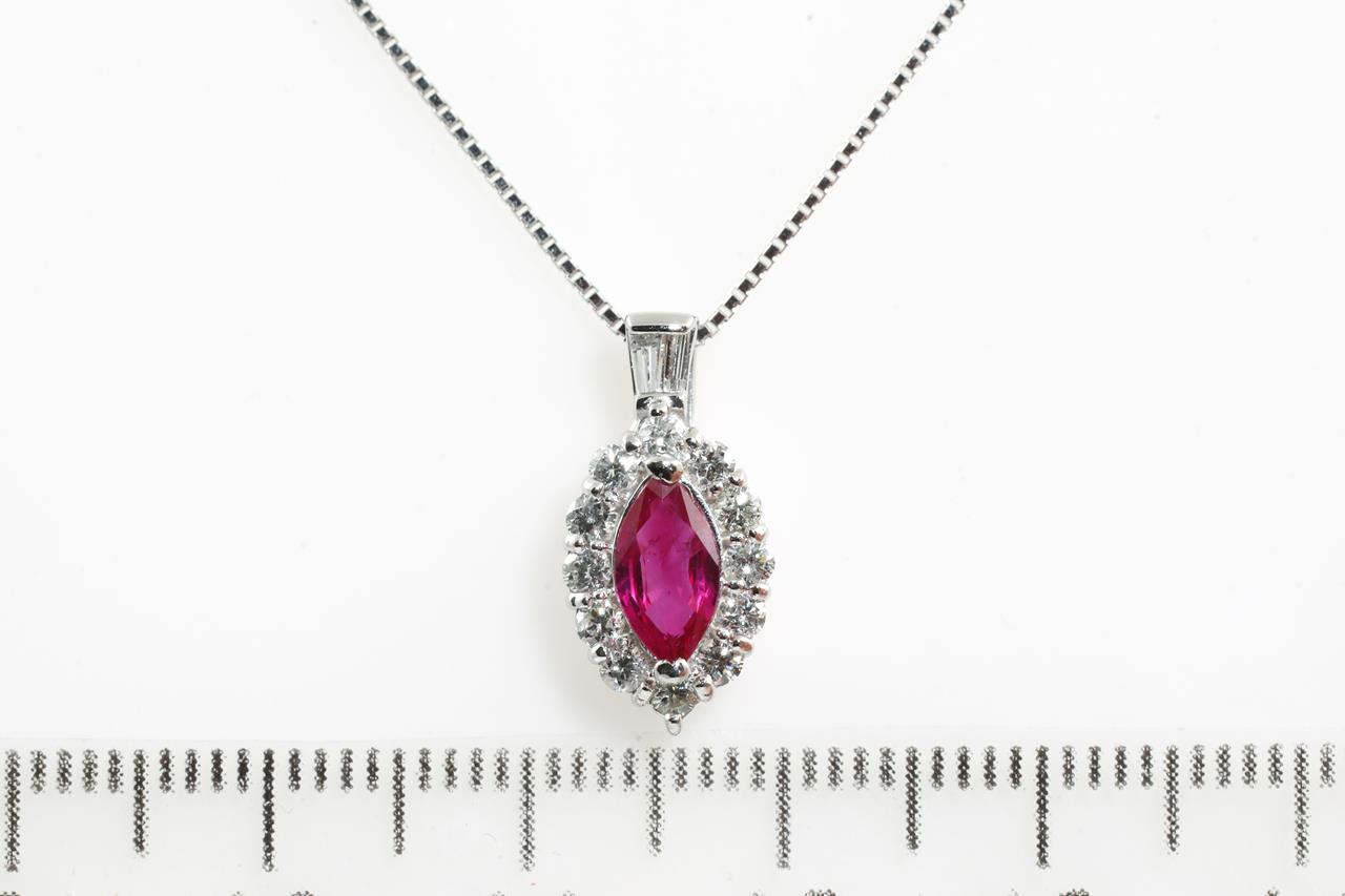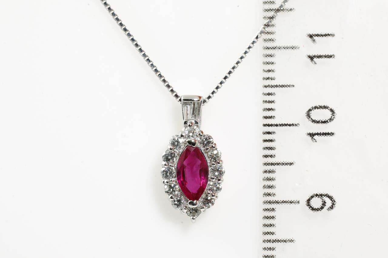 Ruby and Diamond pendant with a marquise cut Ruby of 0.58ct and Diamonds totalling 0.39cts (Estimated grading: G SI). Platinum with adjustable 44cm 18ct white gold chain. Weight: 4.3g. (Pre-owned)