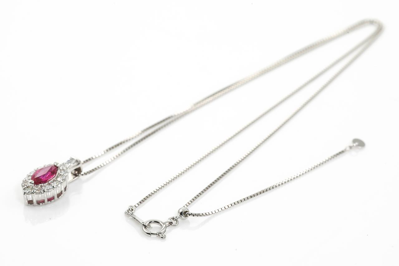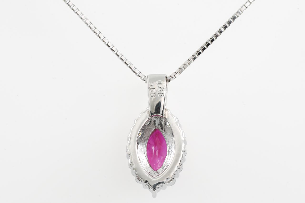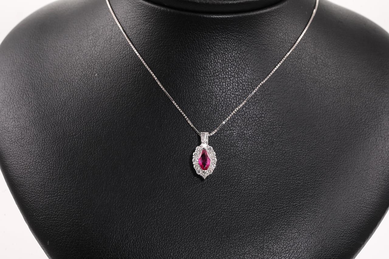 Ruby and Diamond pendant with a marquise cut Ruby of 0.58ct and Diamonds totalling 0.39cts (Estimated grading: G SI). Platinum with adjustable 44cm 18ct white gold chain. Weight: 4.3g. (Pre-owned)
