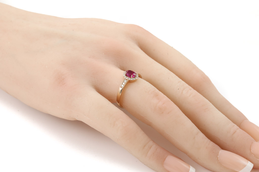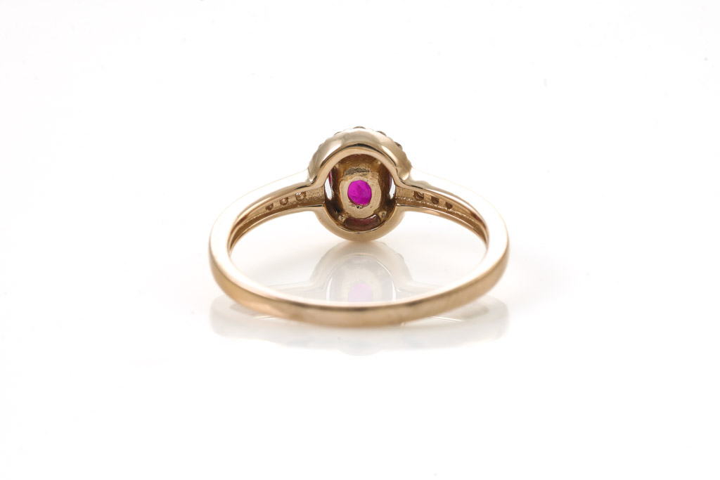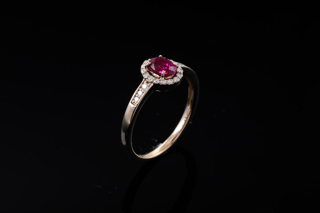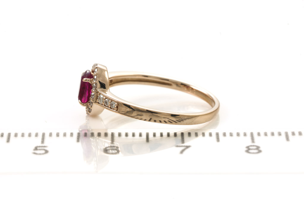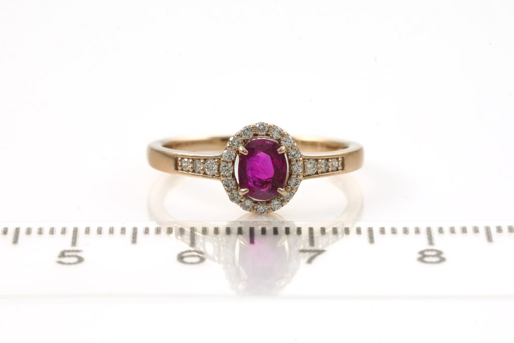 Ruby and Diamond ring with oval shape Ruby of 0.58ct and round Diamond totalling 0.13cts. 18ct rose gold. Ring size L - ring resizing is not recommended. Weight: 2.5g. (Pre-owned)