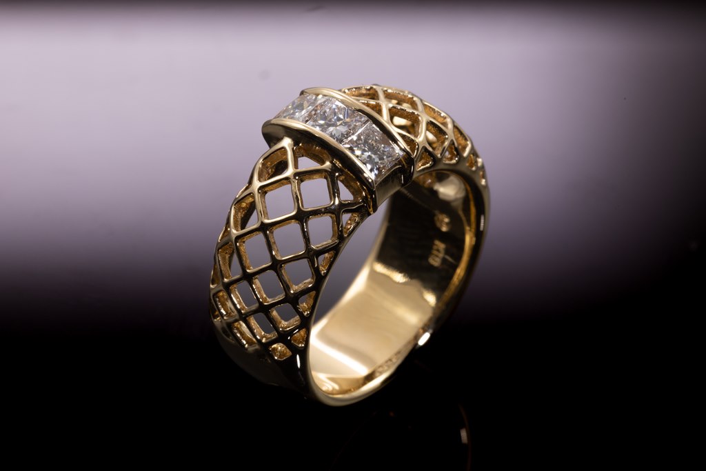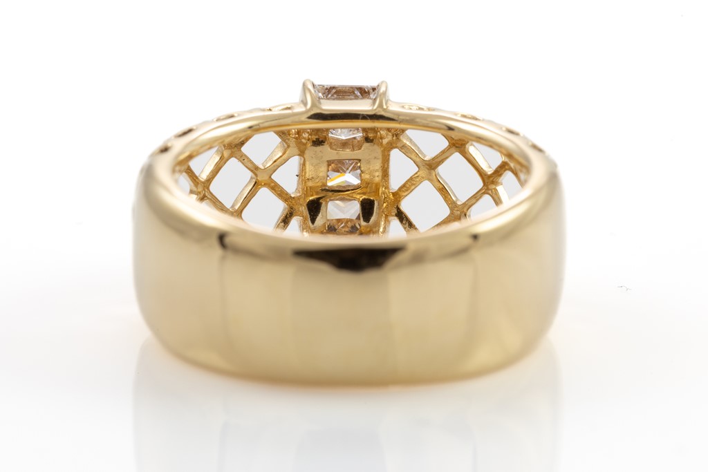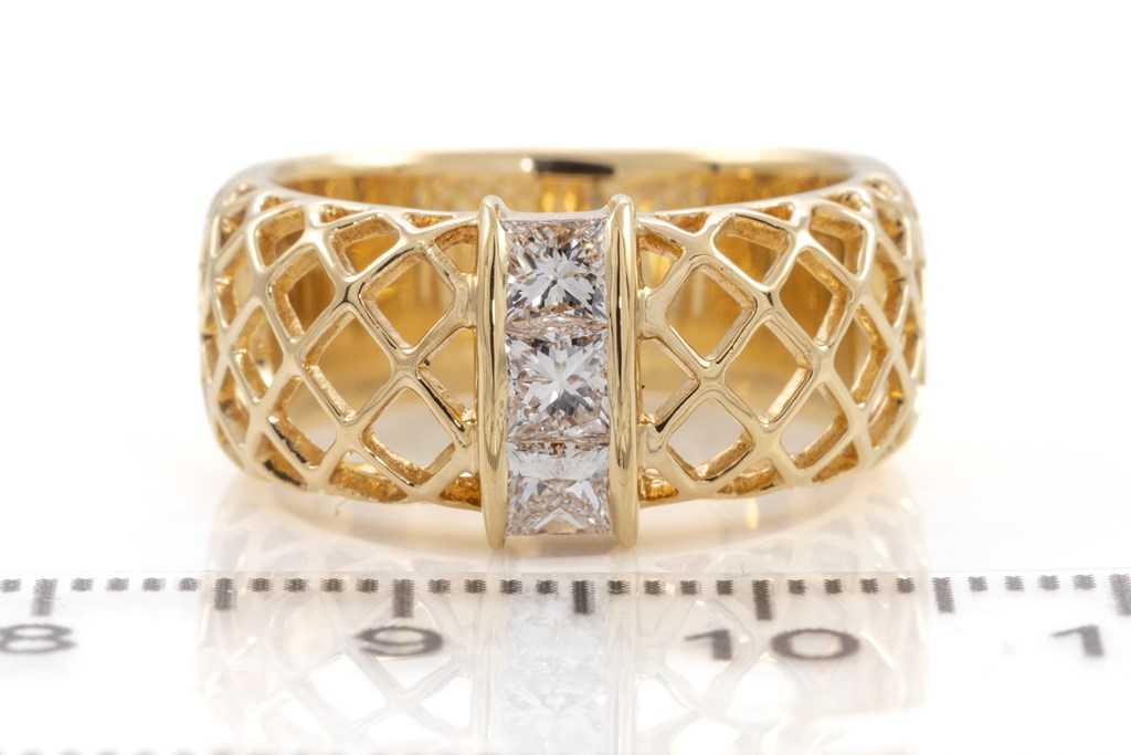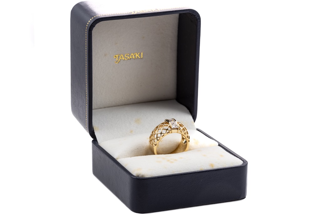 Tasaki ring with 3 princess cut Diamonds totalling 0.58cts (Estimated grading: G VS-SI). 18ct yellow gold. Ring size L - ring resizing is not recommended. Weight: 9g. With Tasaki worn box. (Pre-owned)