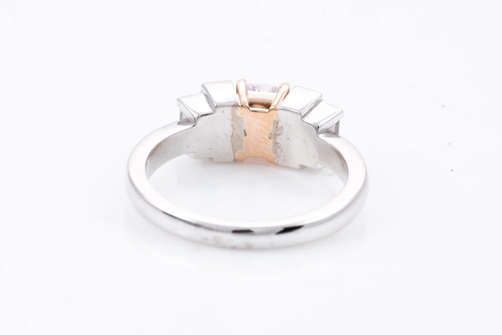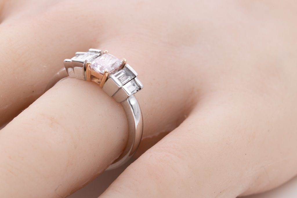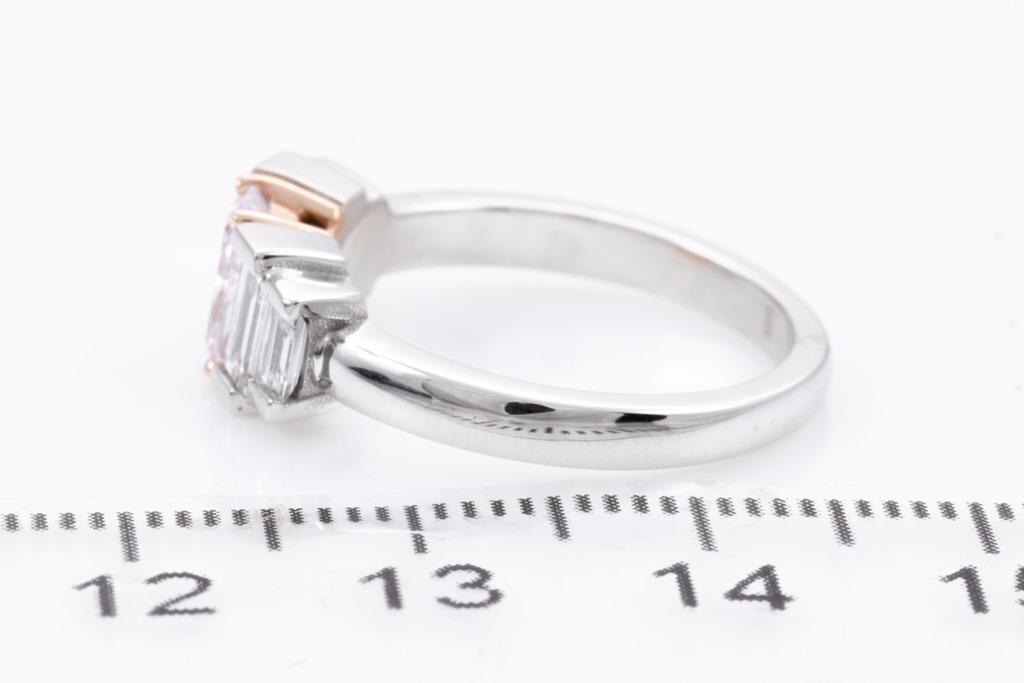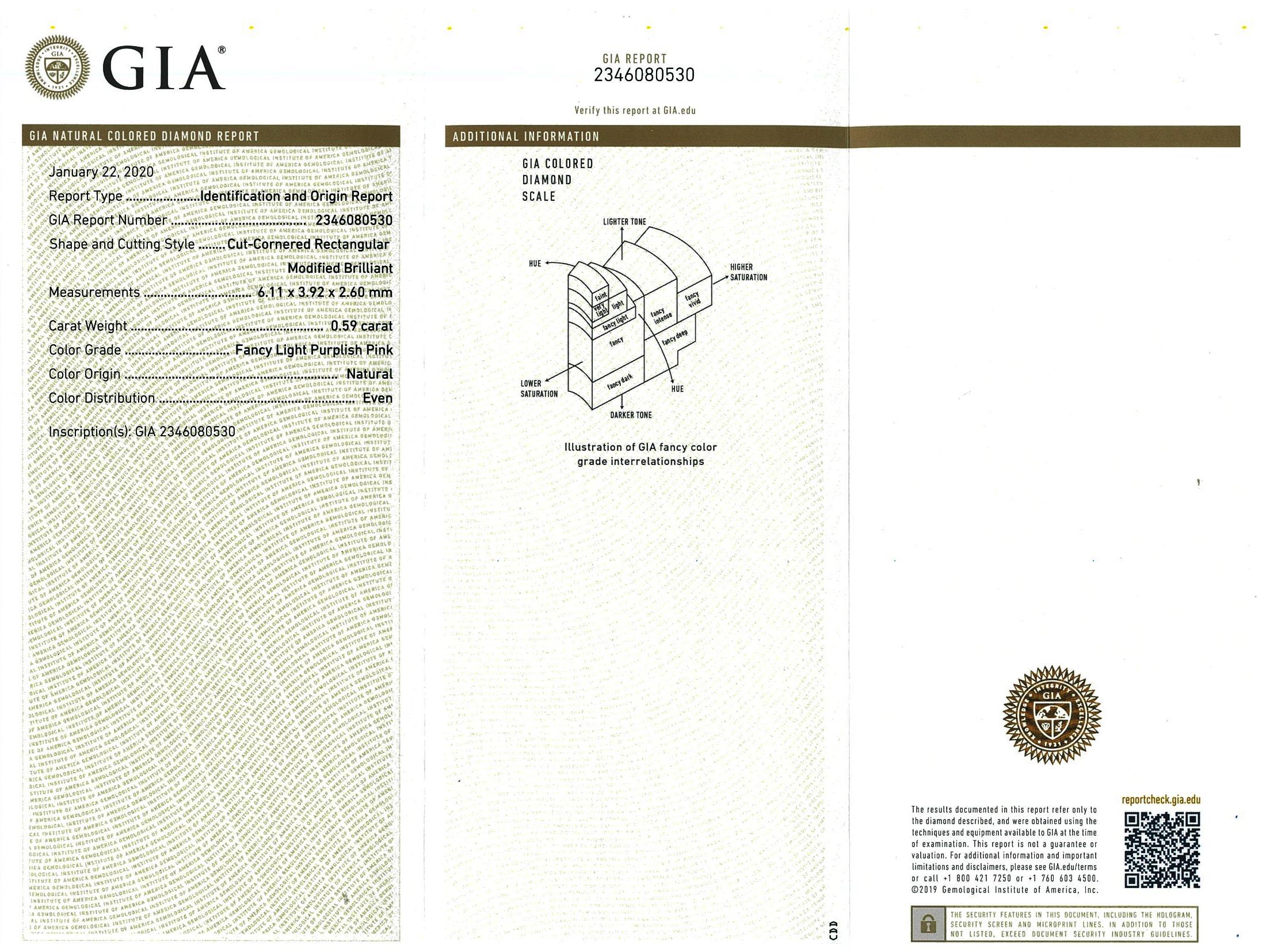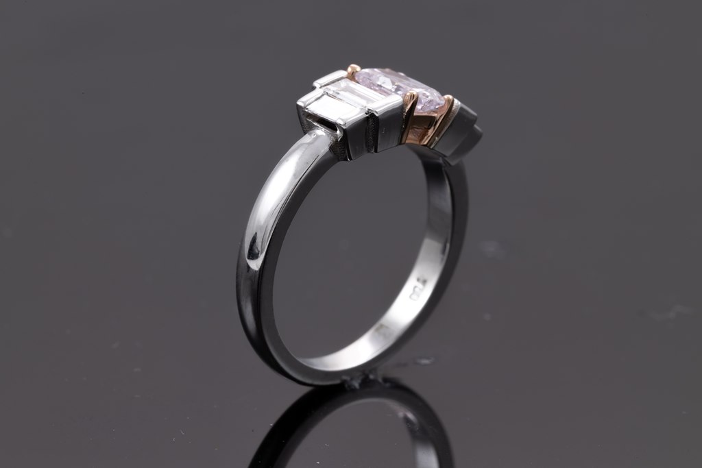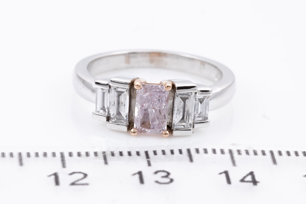 Diamond Ring with centre Radiant cut Diamond of 0.59ct (with GIA report graded as Natural Fancy Light Purplish Pink Even #2346080530. FSA estimated clarity grade: P3) set with 4 shoulder baguette cut diamonds totalling 0.52cts (Estimated grading: F-G VS). 18ct rose and white gold. Ring size L1/2. Weight 5.7g. (new)