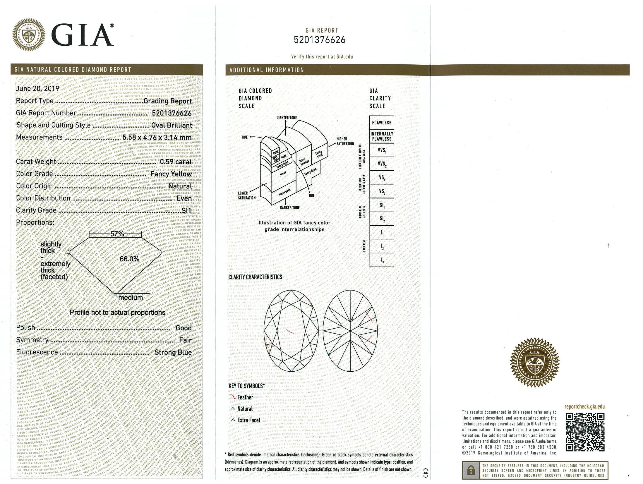 A loose Fancy Yellow oval cut Diamond, of 0.59ct. With GIA report graded Fancy Yellow SI1 #5201376626. (As New)