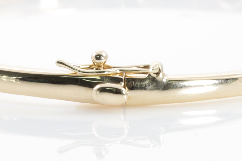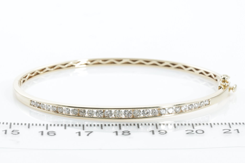 Diamond bangle with 25 round Diamonds totalling approximately 0.60cts (Estimated grading: J-K SI-P1). 10ct yellow gold. Circumference: 17cm. Weight: 7.7g. Engraved MHJ. (Pre-owned)