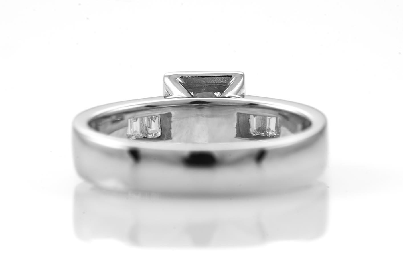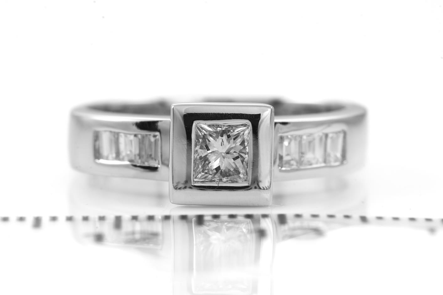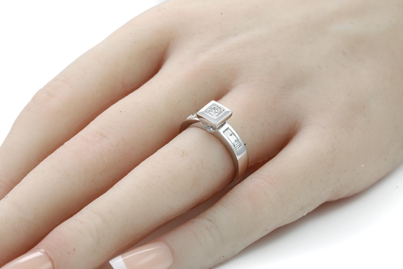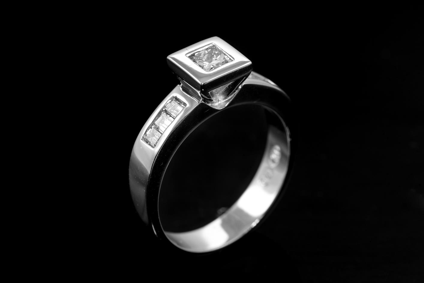 Diamond Ring with centred princess cut Diamond of approximately 0.30ct and baguette cut Diamonds totalling approximately 0.30cts. Total diamond weight