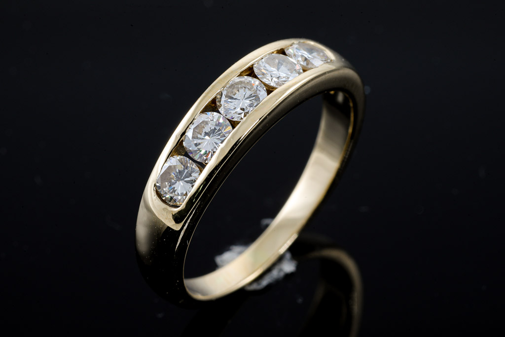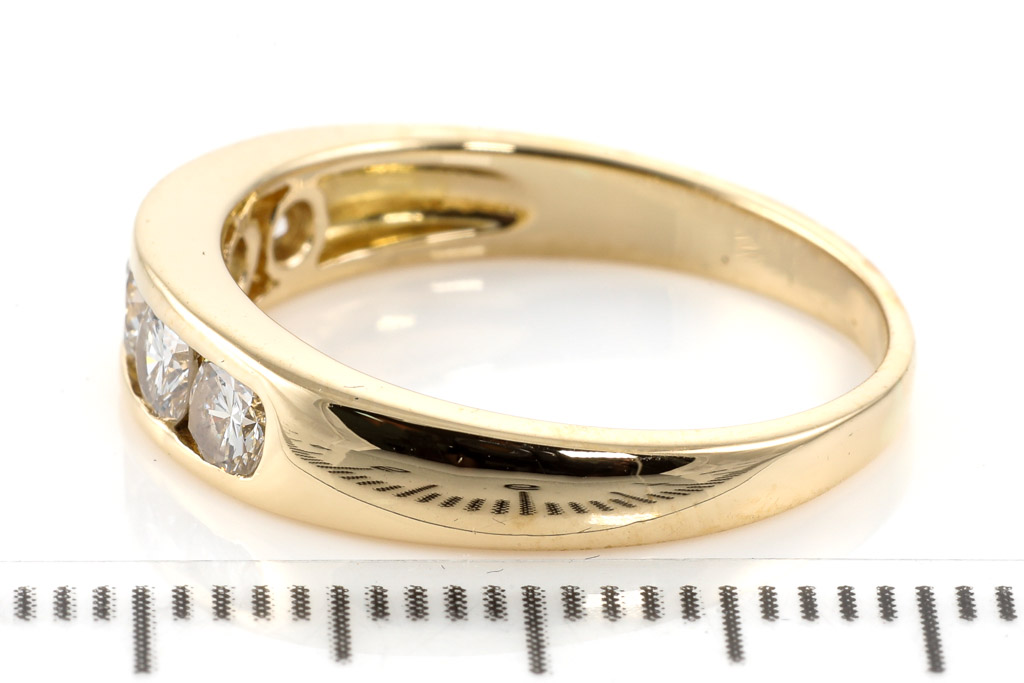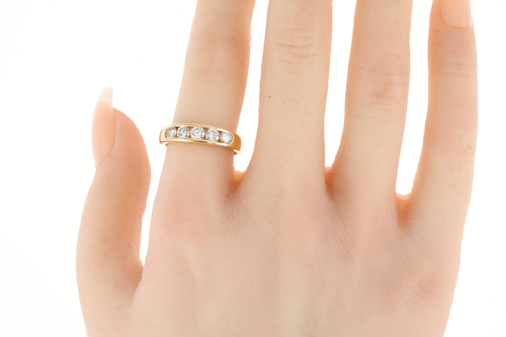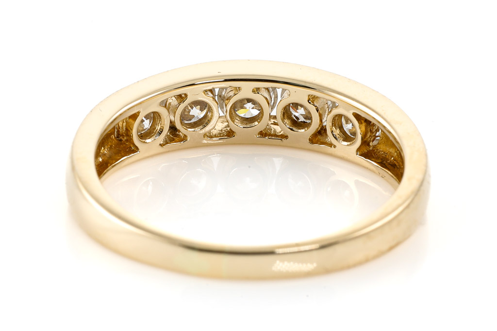 Diamond eternity ring with 5 round Diamonds totalling 0.60cts (Estimated grading: H SI) 18ct yellow gold. Ring size N 1/2. Weight: 3.9g (Pre-owned)