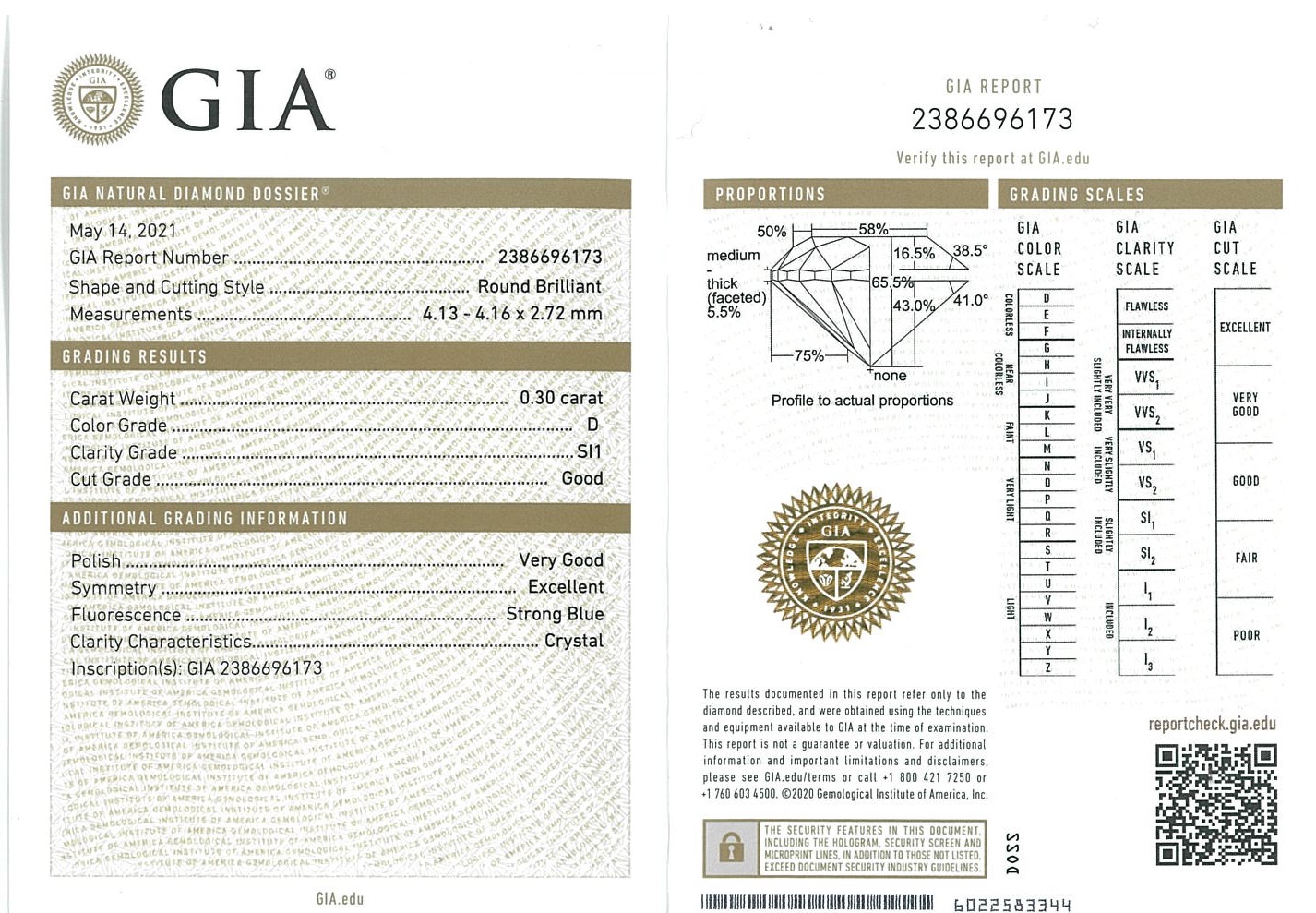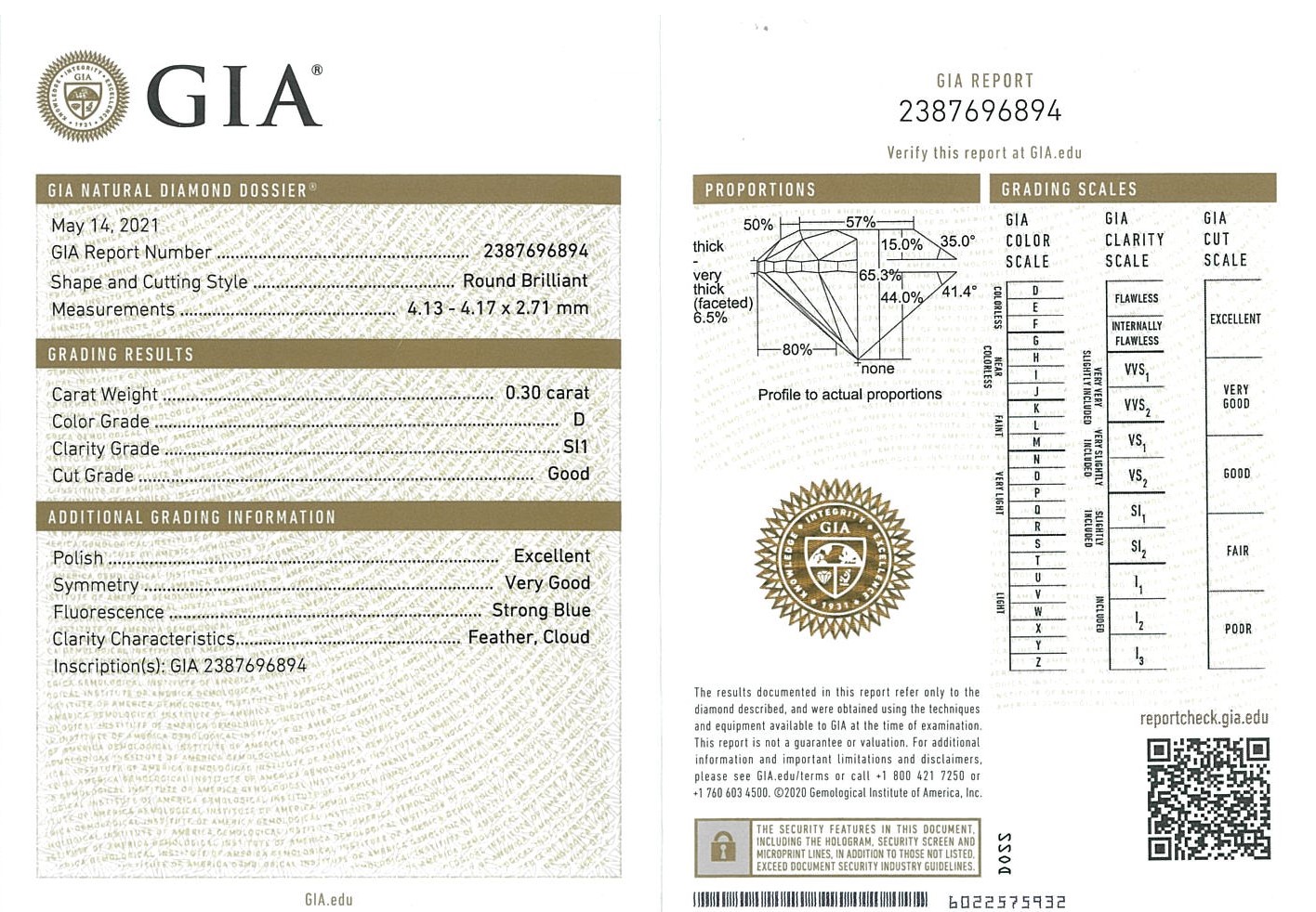 Diamond stud earring with 2 Round Brilliant Cut Diamonds totalling 0.60cts (with GIA report both graded as D SI1 #2387696894, 2386669173). 18ct white gold. Weight: 1.5g (New)