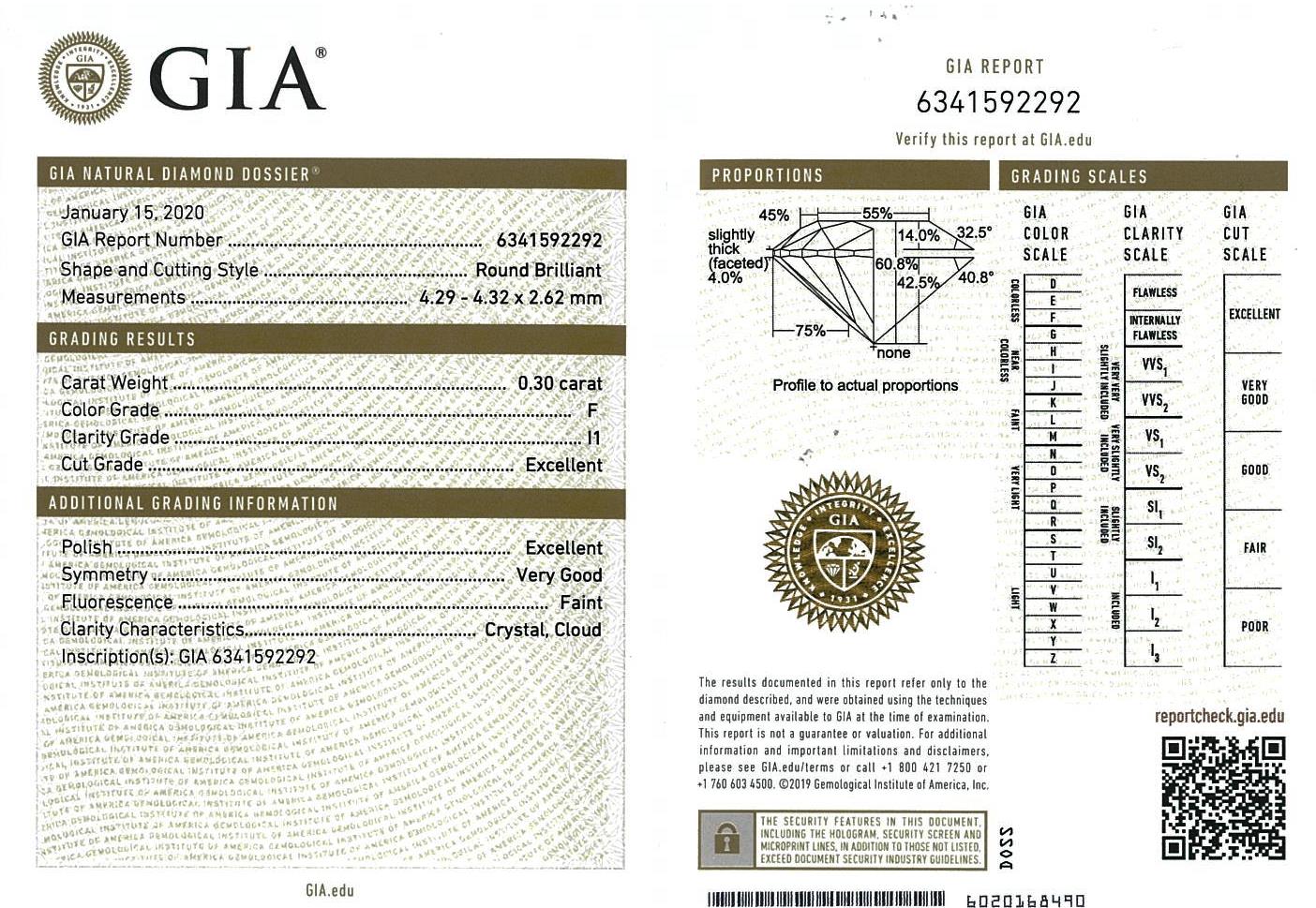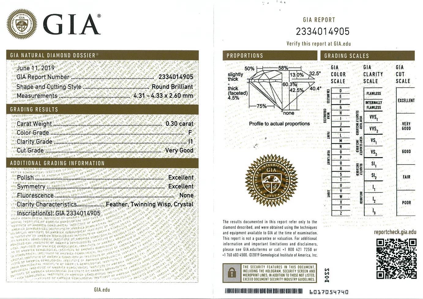 Diamond stud earrings with 2 round brilliant cut Diamonds totalling 0.60cts (with GIA reports graded as F P1 #6341592292, 2334014905). 18ct white gold. Weight: 1.4g. (New).