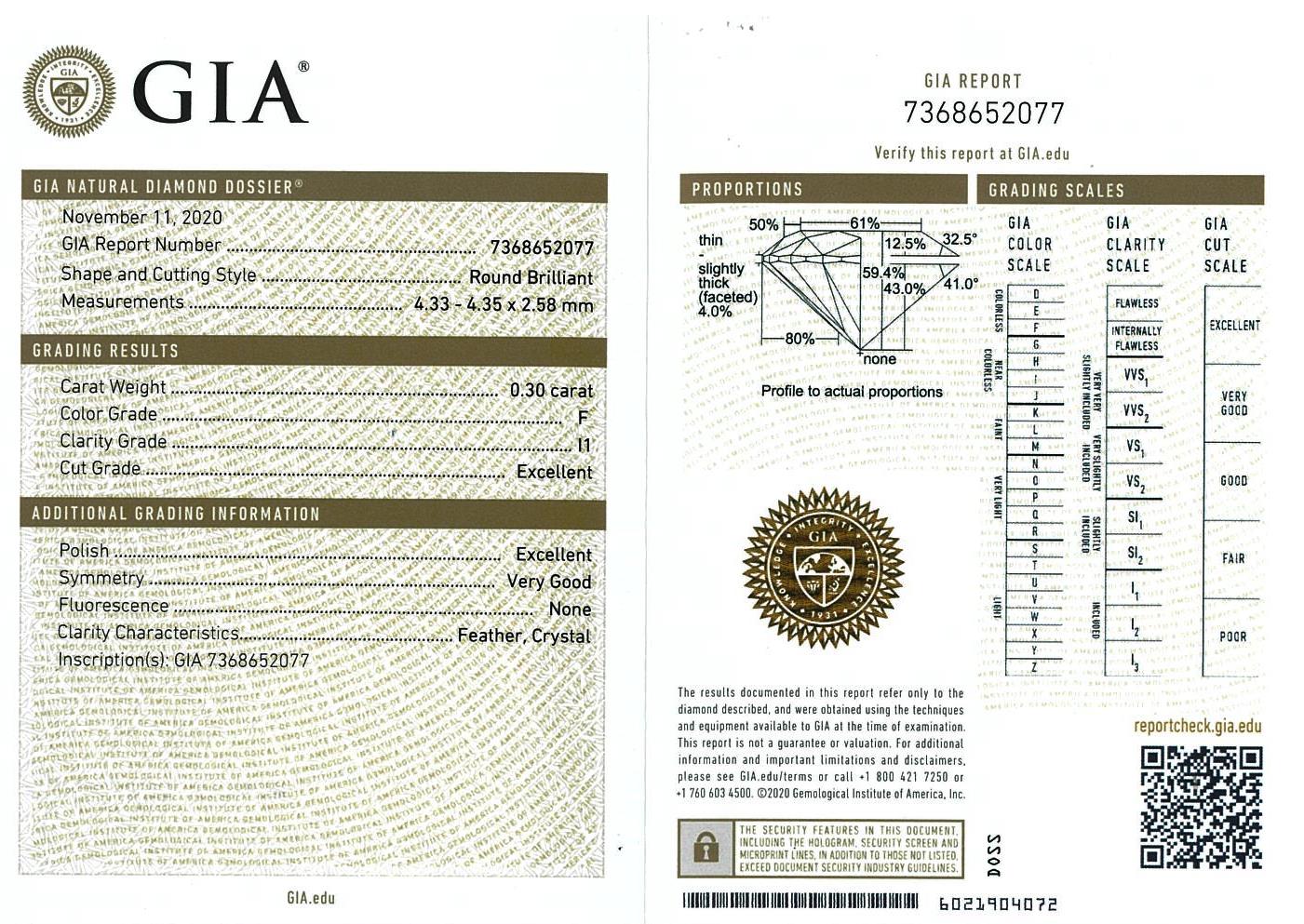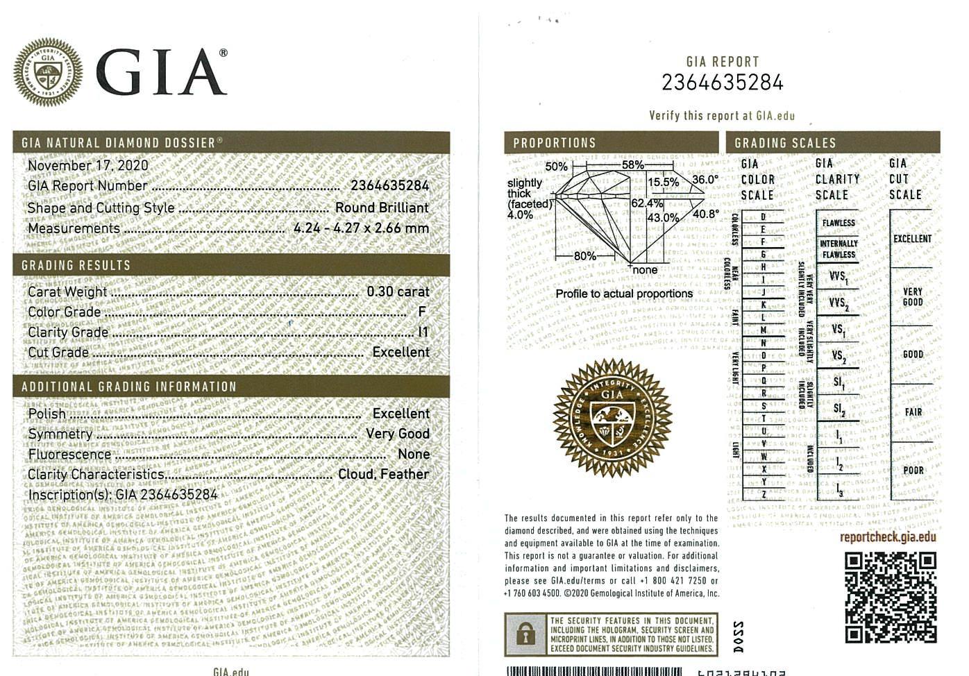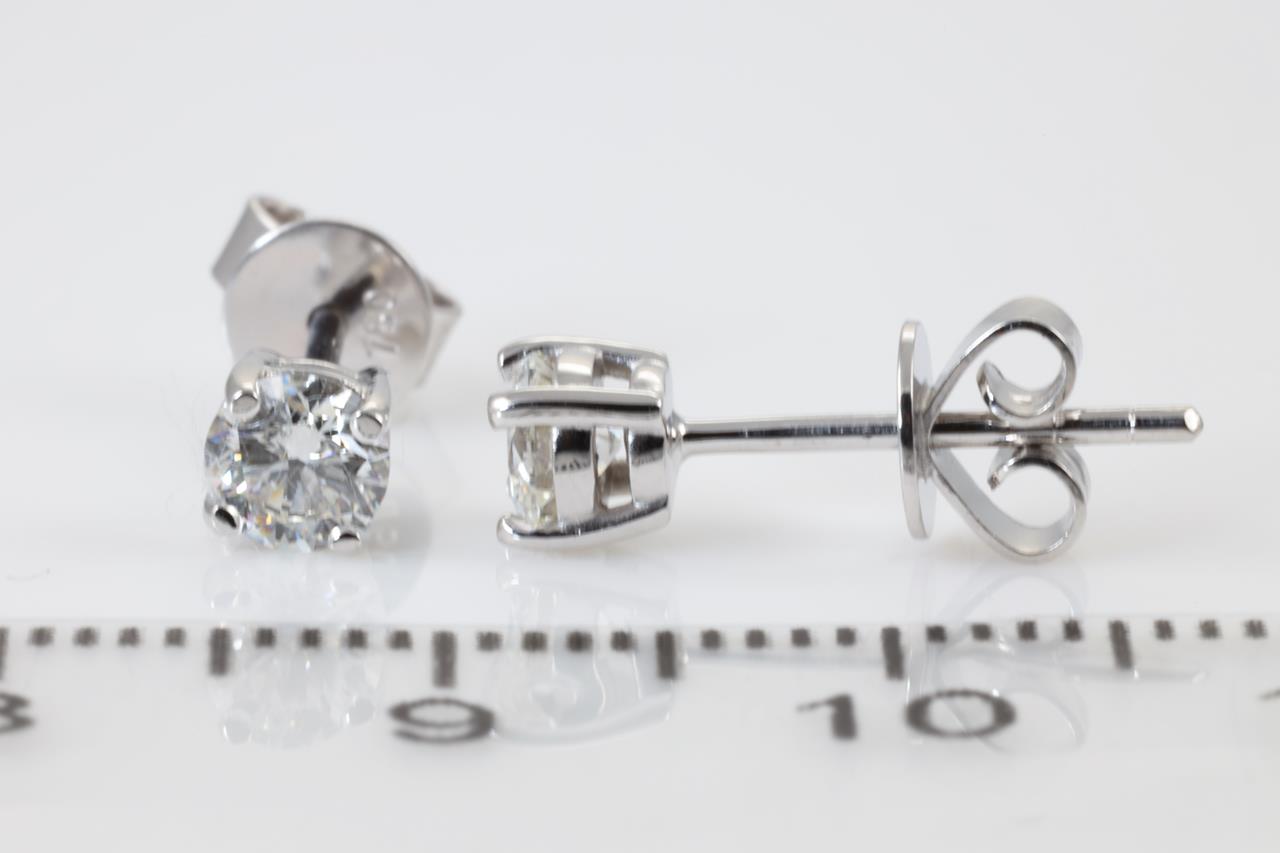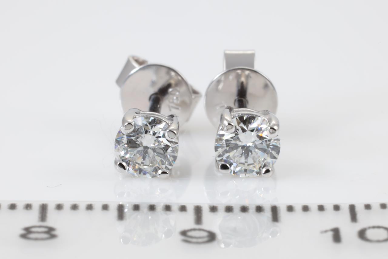 Diamond stud earrings with 2 round brilliant cut Diamonds totalling 0.60cts (with GIA reports graded as F P1 #2364635284, 7368652077). 18ct white gold. Weight: 1.6g. (New).