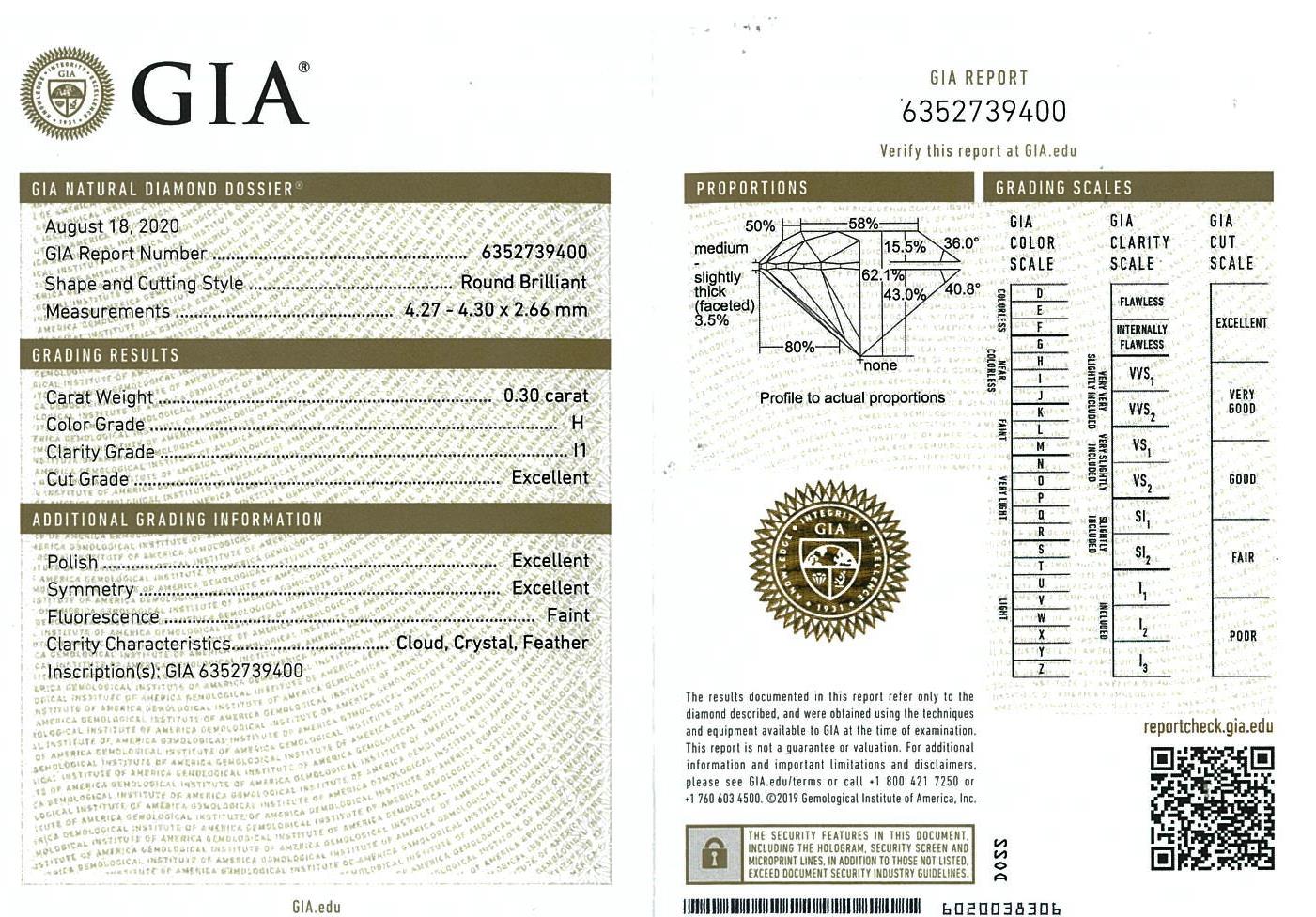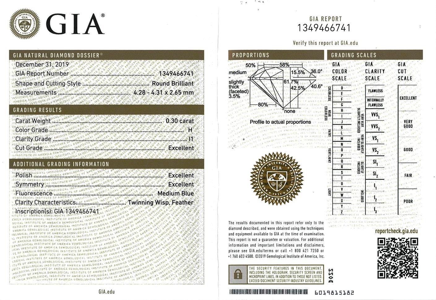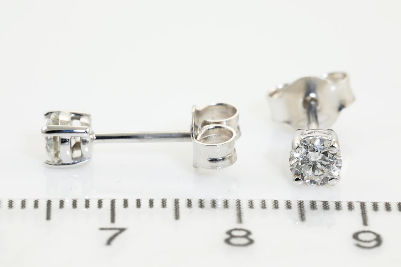 Diamond stud earrings with 2 round brilliant cut Diamonds totalling 0.60cts (with GIA reports graded as H P1 #6352739400, 1349466741). 18ct white gold. Weight: 1.8g. (New).