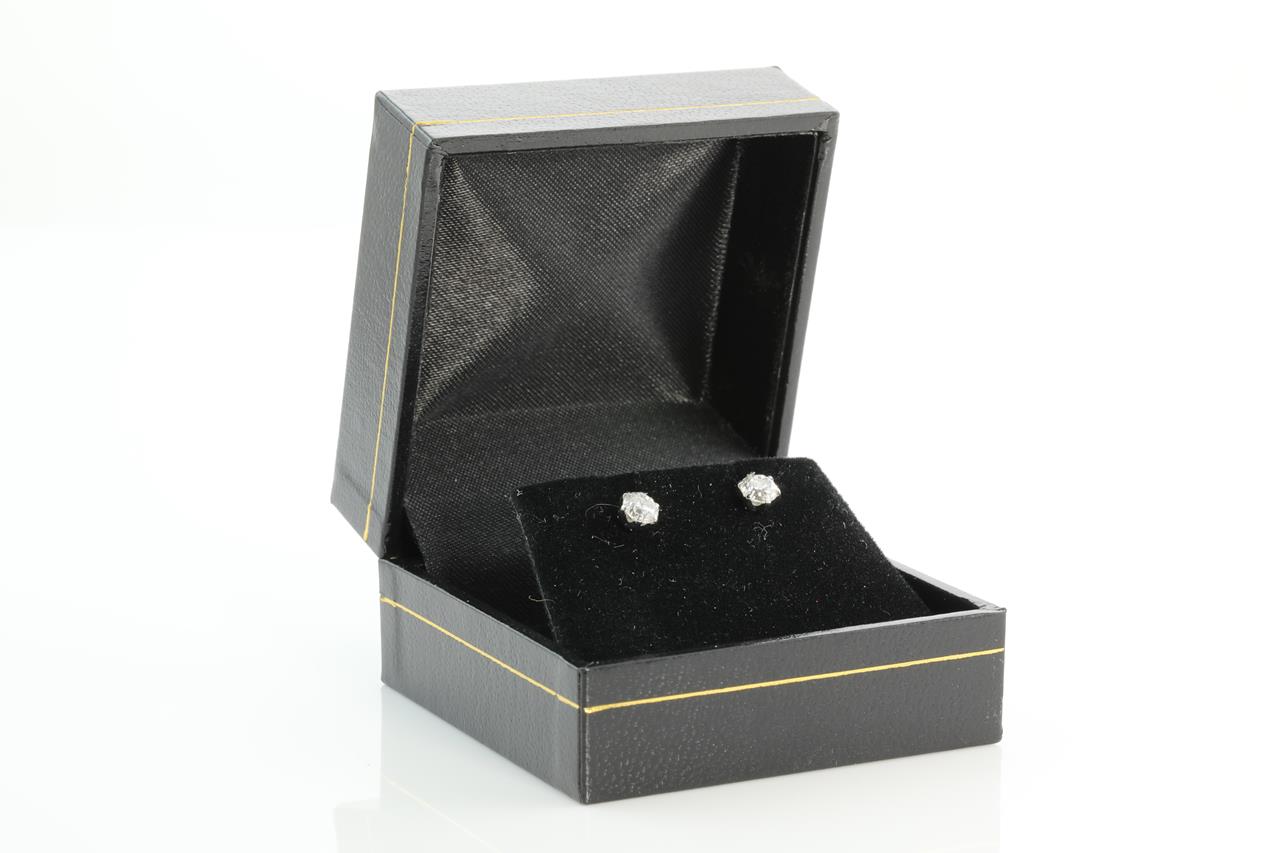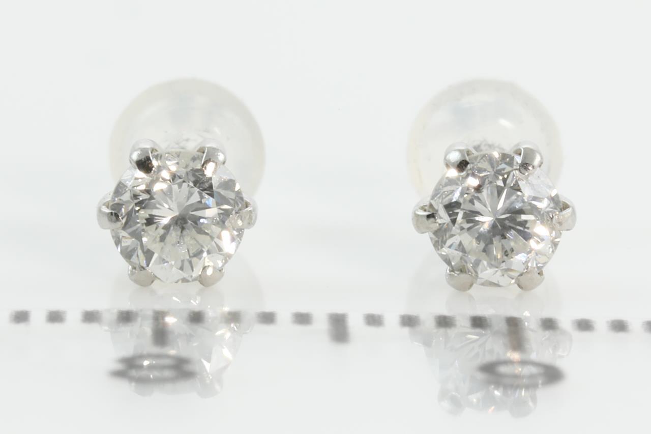 Diamond stud earrings with 2 round brilliant cut Diamonds totalling 0.60cts (Estimated grading: G-H SI). Platinum with silicone backs. Weight: 0.5g (As New)