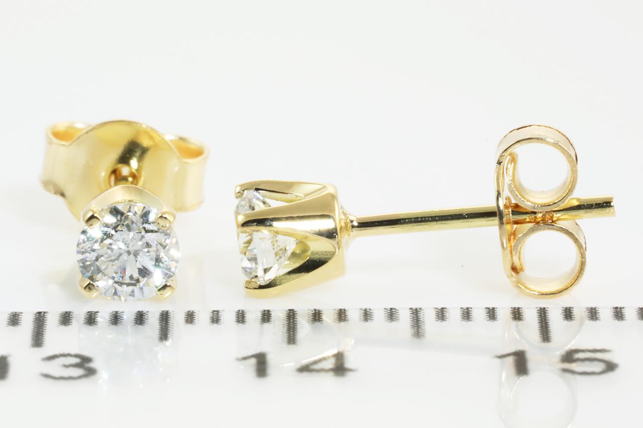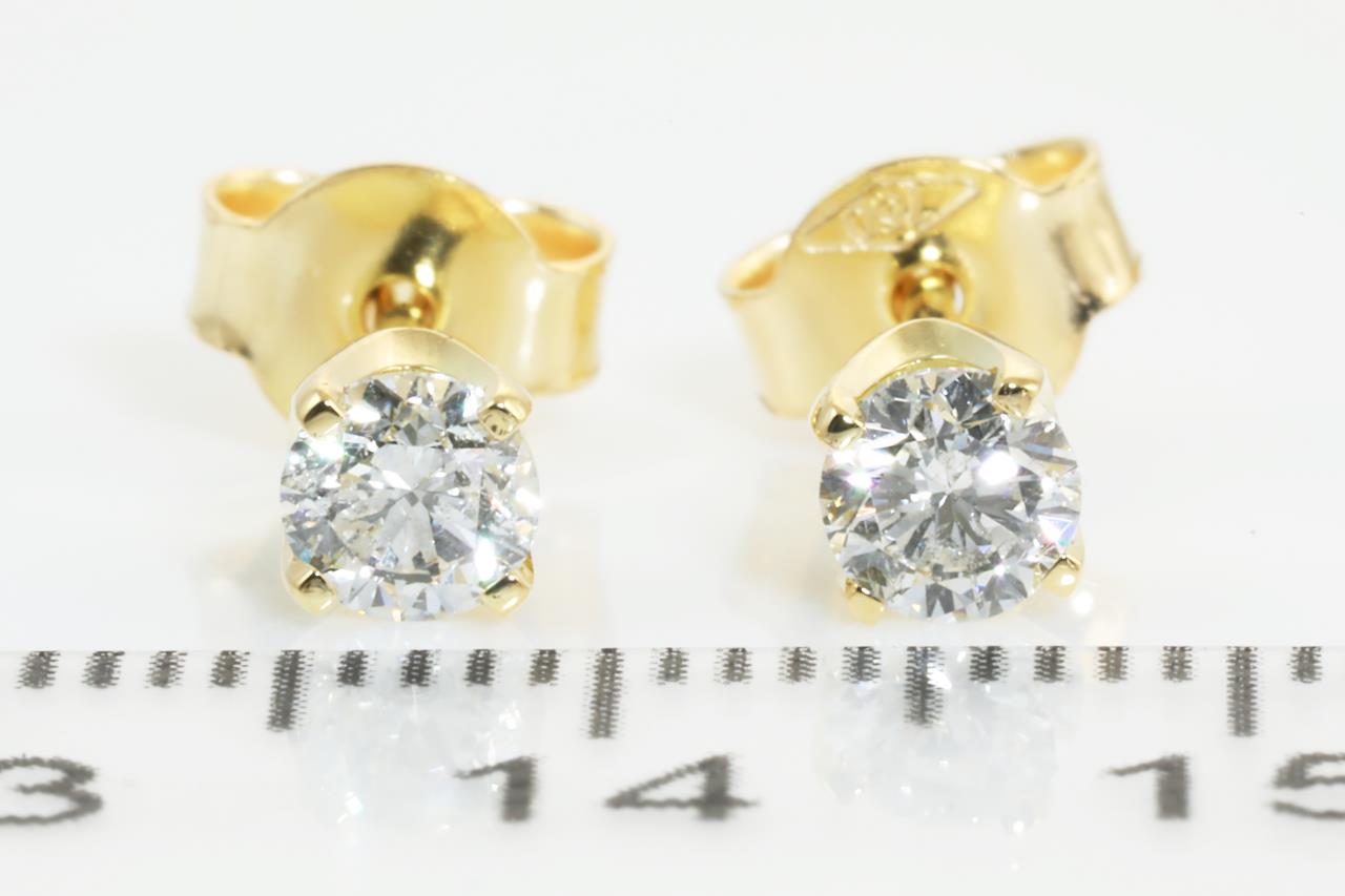Diamond stud earrings with 2 round brilliant cut Diamonds totalling 0.60cts (Estimated grading: F P1-2). 18ct yellow gold. Weight: 1.4g. (New).