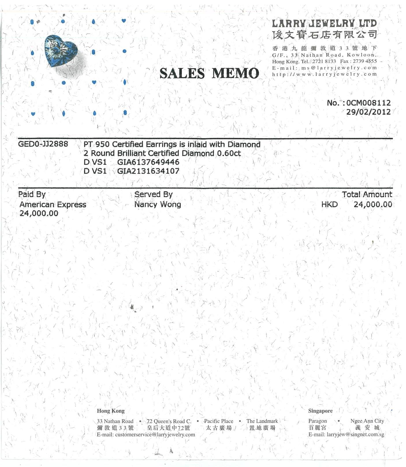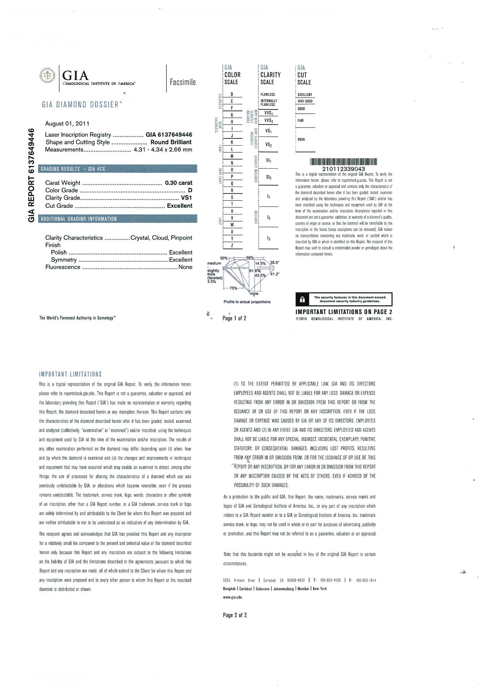 Diamond Studs with 2 round brilliant cut Diamonds totalling 0.60cts (with copy of GIA certificate reports graded as D VS1 #2131634107, 6137649446). Platinum with 18ct white gold butterflies. Weight 1.12g. (Pre-owned)
