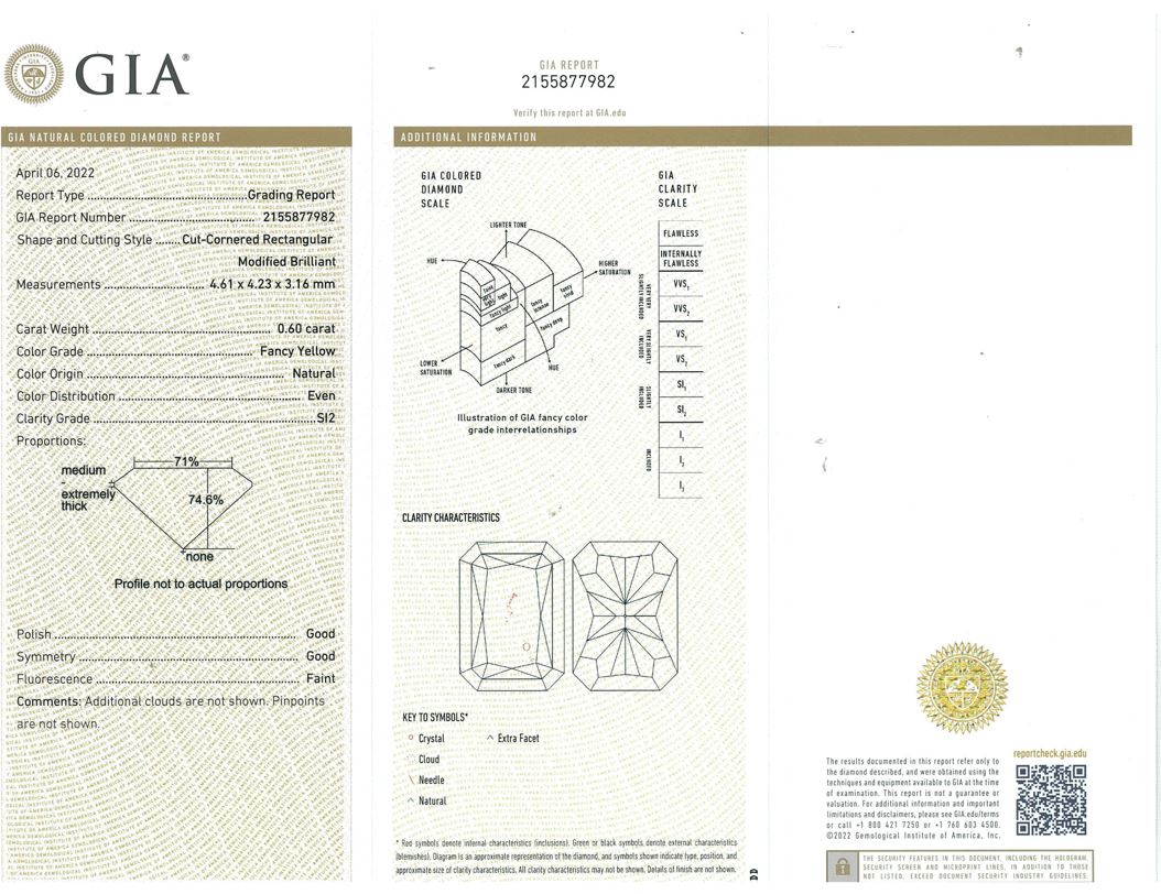 A loose radiant cut Diamond of 0.60ct (with GIA report graded as Natural Fancy Yellow Even SI2 #2155877982). (New)