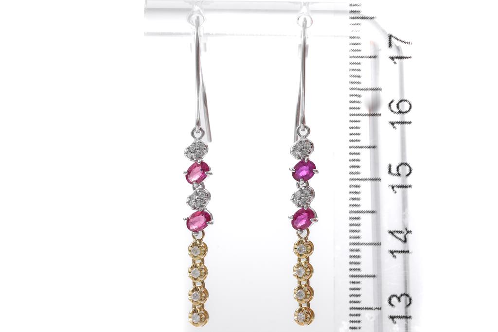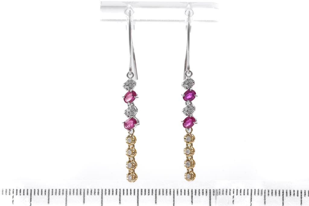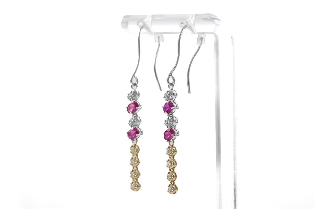 Ruby and Diamond shepherd hook earrings with 4 oval shape Rubies totalling approximately 0.60cts and round Diamonds totalling approximately 0.24cts. 18ct yellow gold and 14ct white gold with silicon backs. Weight: 2.2g. (Pre-owned)