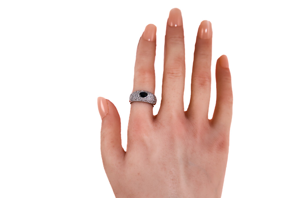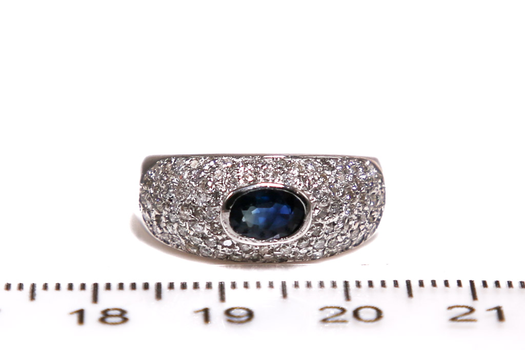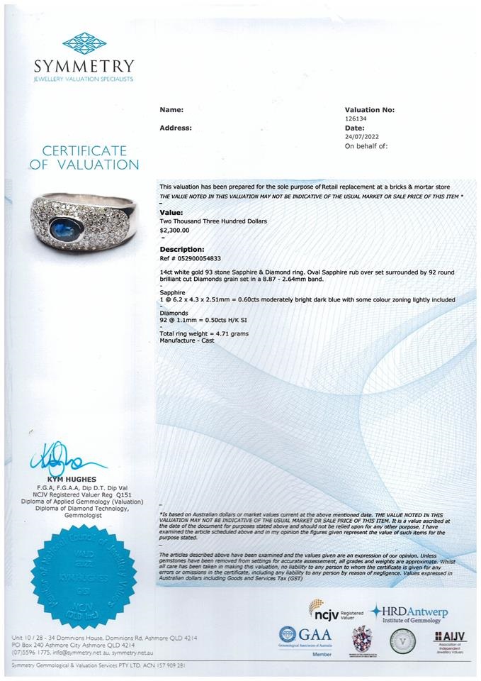 Sapphire and Diamond ring with oval shape dark blue Sapphire of 0.60ct and round Diamonds totalling 0.50cts (Estimated grading: H-K SI). 14ct white gold. Ring size M1/2. Weight: 4.7g. With Valuation Certificate Ref# 052900054833. (Pre-owned)