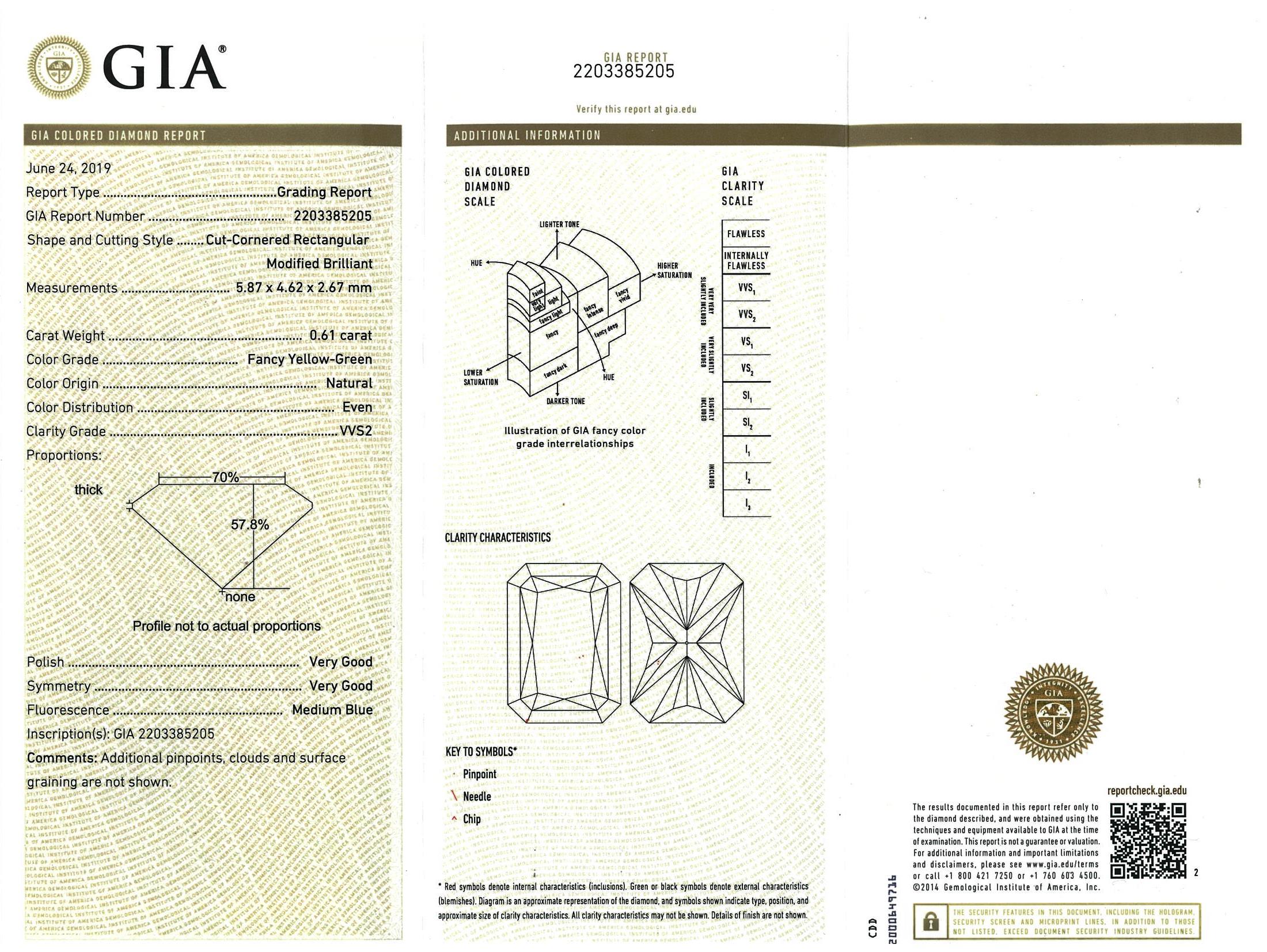 A loose Radiant cut Diamond of 0.61ct (With GIA report graded as Natural Fancy Yellow-Green Even VVS2 #2203385205). (New)