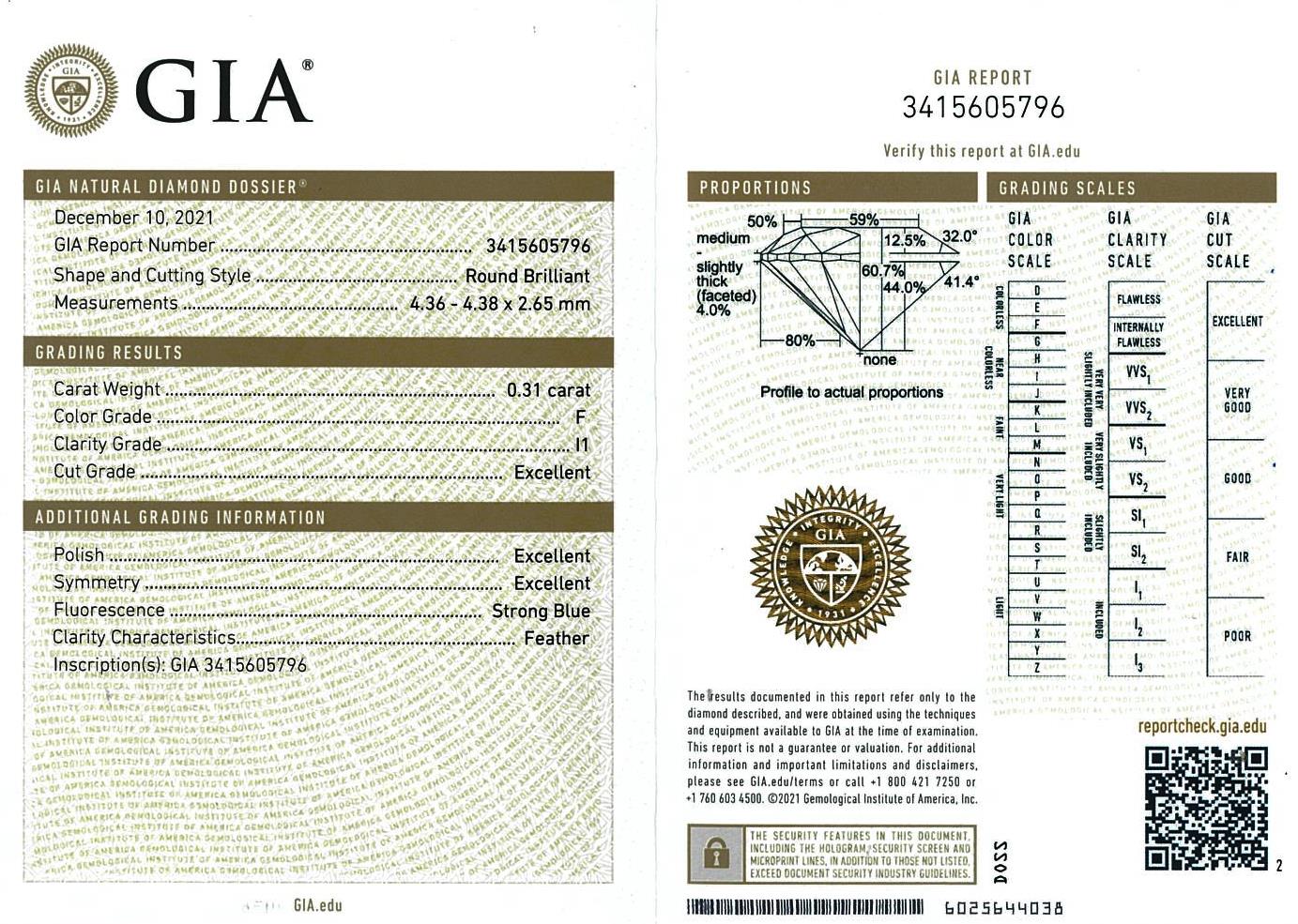 Diamond stud earrings with 2 round brilliant cut Diamonds totalling 0.61cts (both with GIA summary reports graded as F I1, # 2417620584, 3415605796). 18ct white gold. Weight: 1.3g. (New)
