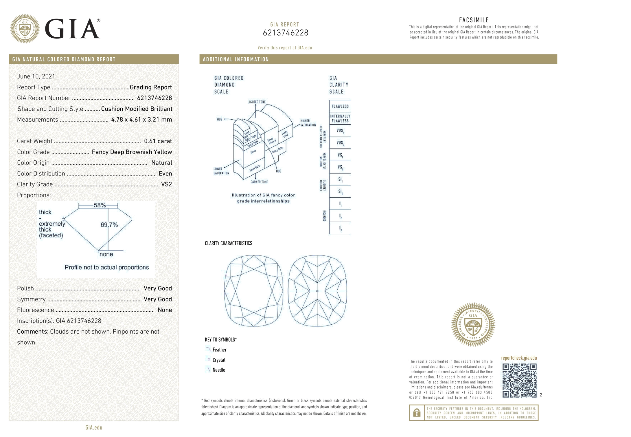 A loose cushion cut Diamond of 0.61ct (with GIA report graded as Natural Fancy Deep Brownish Yellow Even VS2#6213746228). (New)