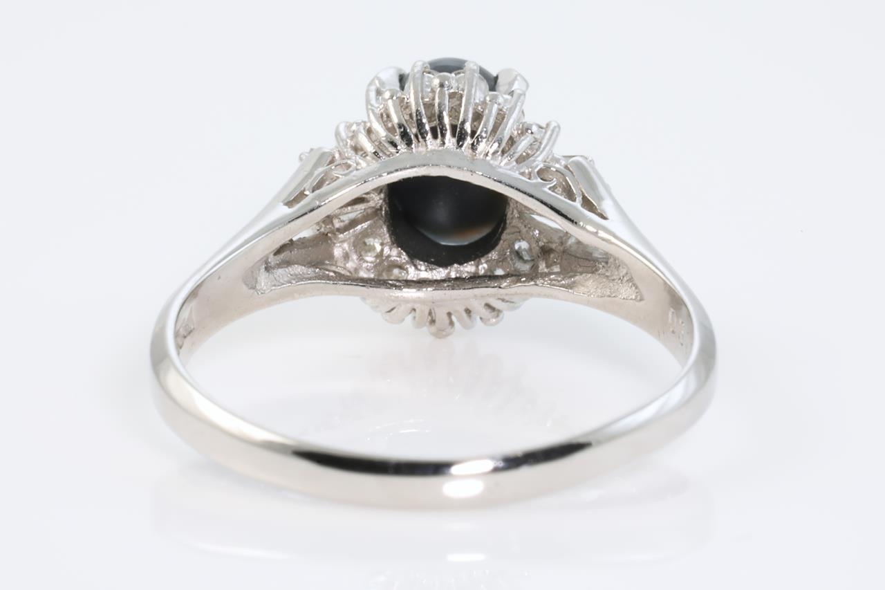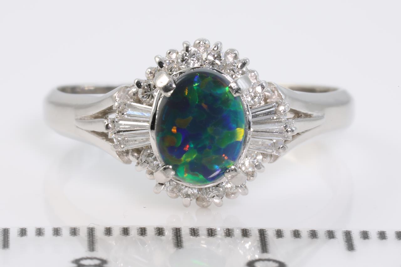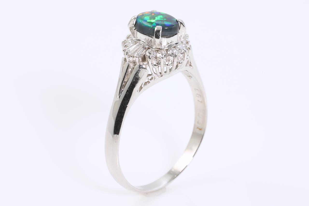 Opal and Diamond ring with oval shape Opal of 0.61ct with baguette and round Diamonds totalling 0.31cts (Estimated grading: G-H SI). Platinum. Ring size: N. Weight: 4.4g (Pre-owned)