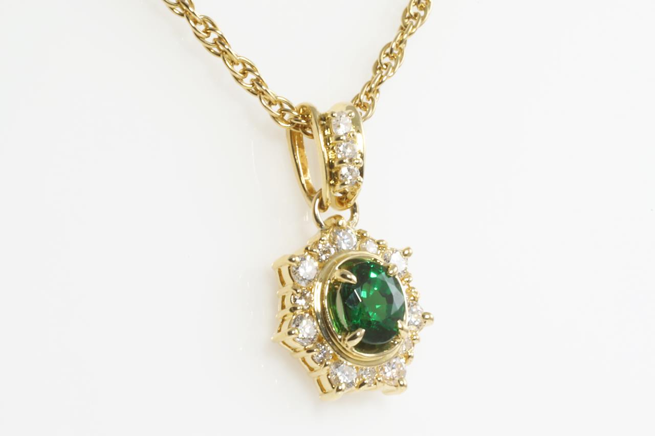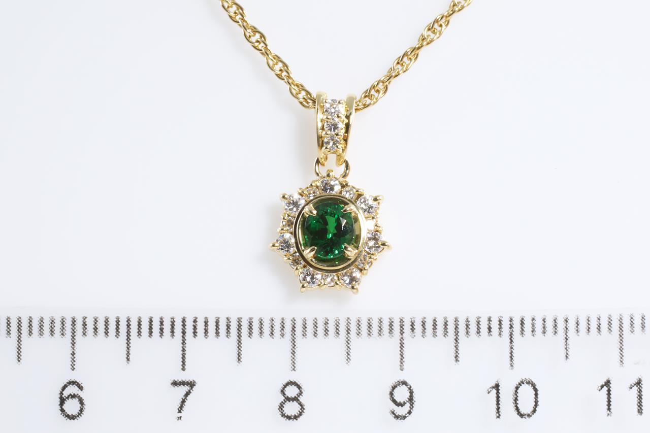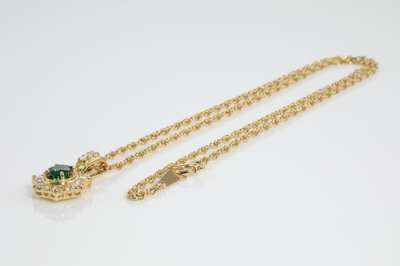 Tsavorite and Diamond pendant with round Tsavorite Garnet of 0.61cts and Diamonds totalling 0.34cts (Estimated grading: G VS). 18ct yellow gold with 18ct gold 40cm chain. Weight: 6.0g (Pre-owned)