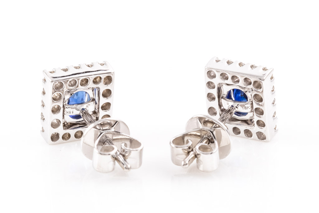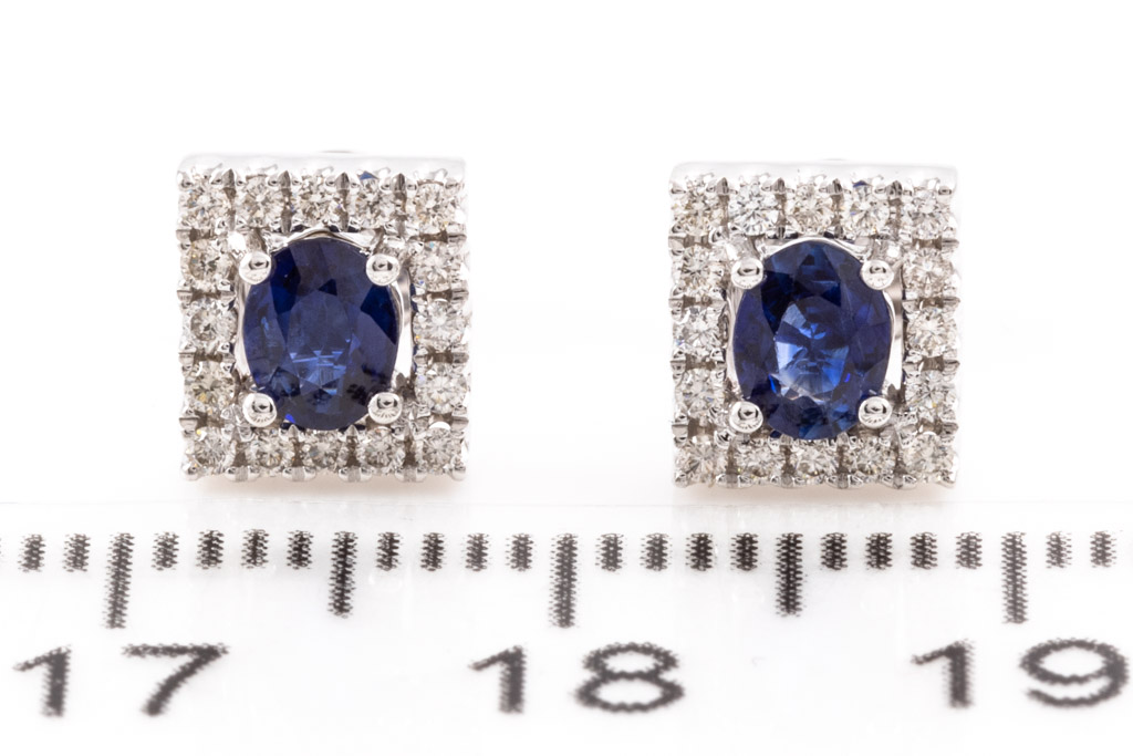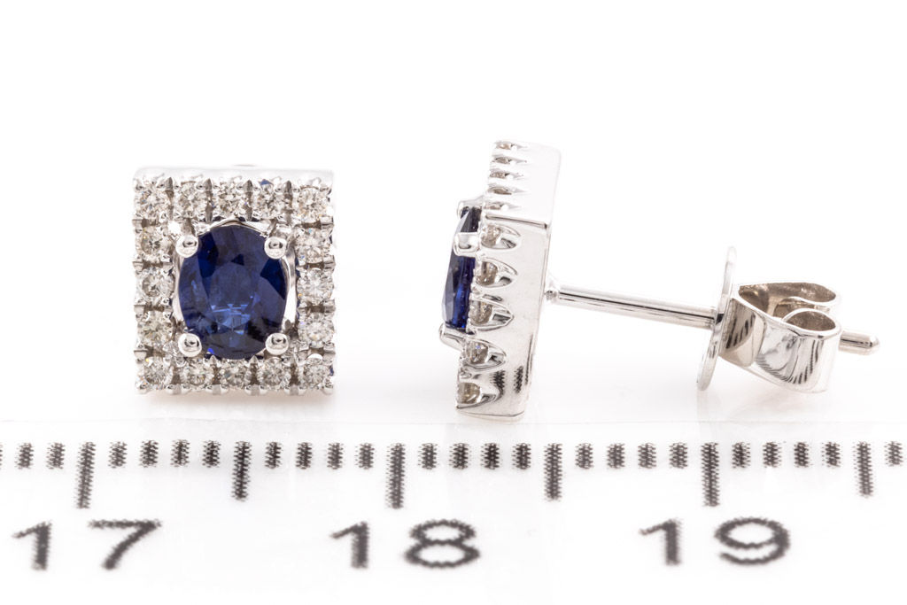 Sapphire and Diamond earrings with oval shape Sapphires totalling 0.61cts and round Diamonds totalling 0.21cts. 18ct white gold. Weight: 2.6g. (New)