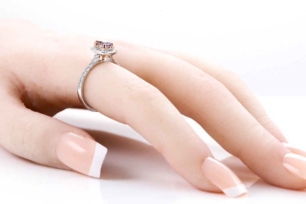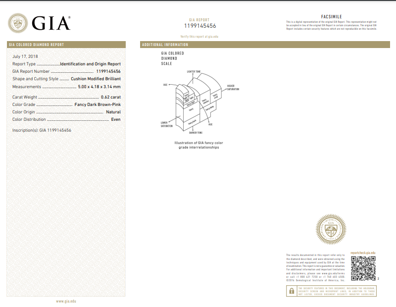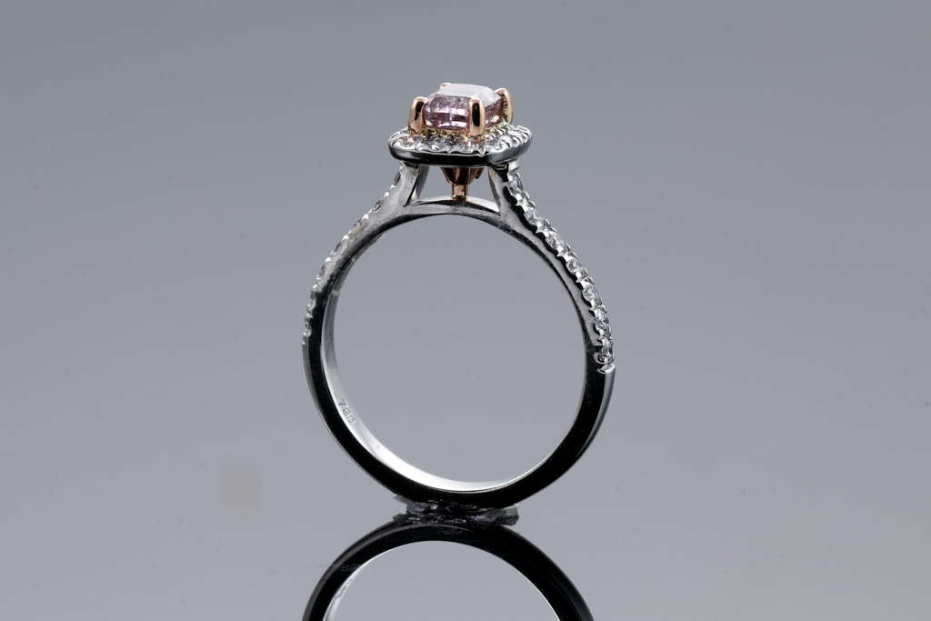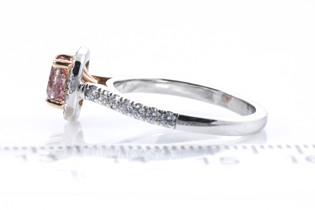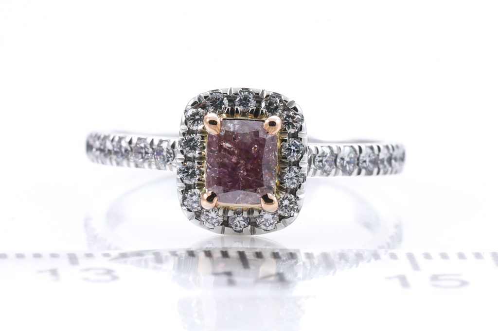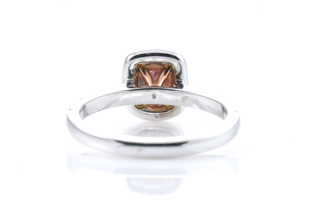 Diamond Halo ring with centre cushion cut Diamond of 0.62ct (with GIA report graded as Natural Fancy Dark Brown-Pink Even #1199145456, FSA estimated clarity grade: P3) and round Diamonds totalling 0.36cts. 18ct rose and white gold. Ring size L1/2. Weight 4.0. (New)