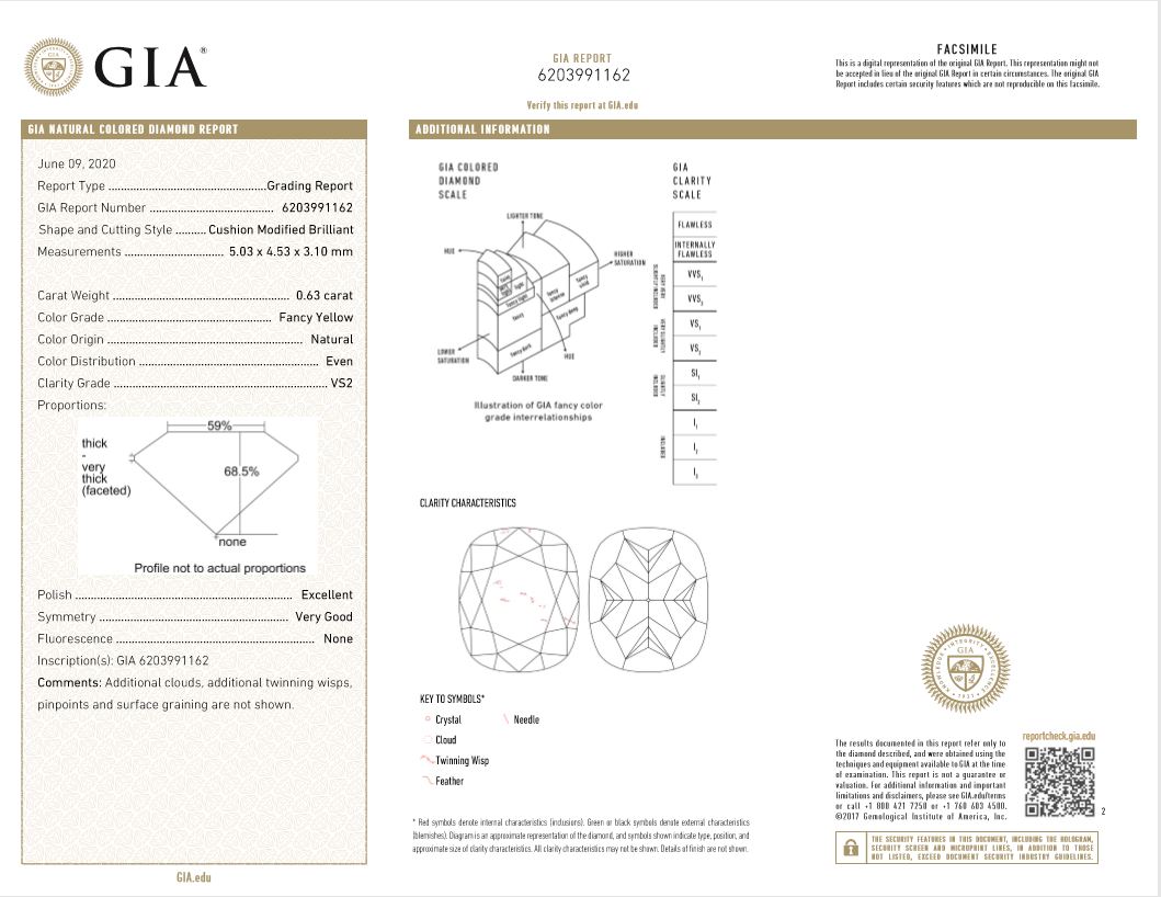 A loose Cushion Cut Diamond of 0.63ct (with GIA report graded as Natural Fancy Yellow Even VS2 #6203991162). (New)
