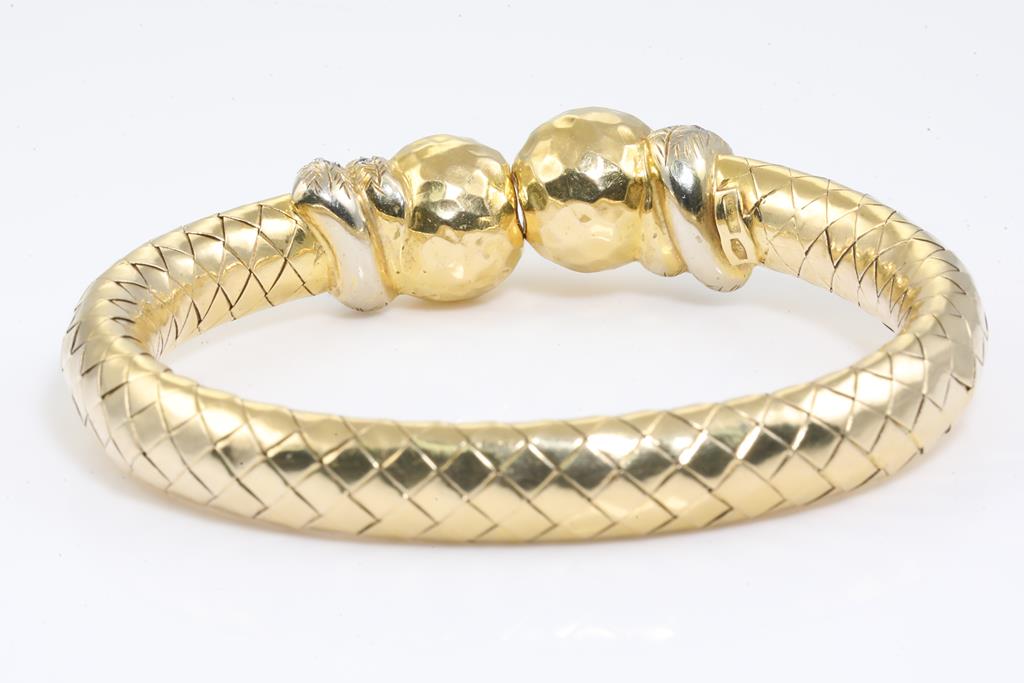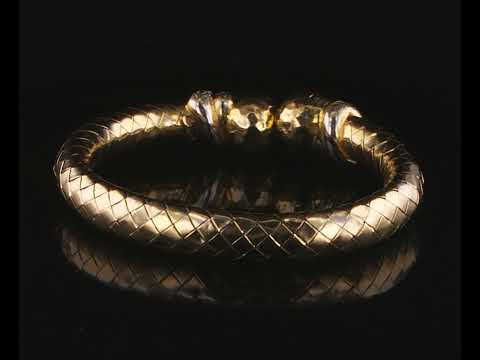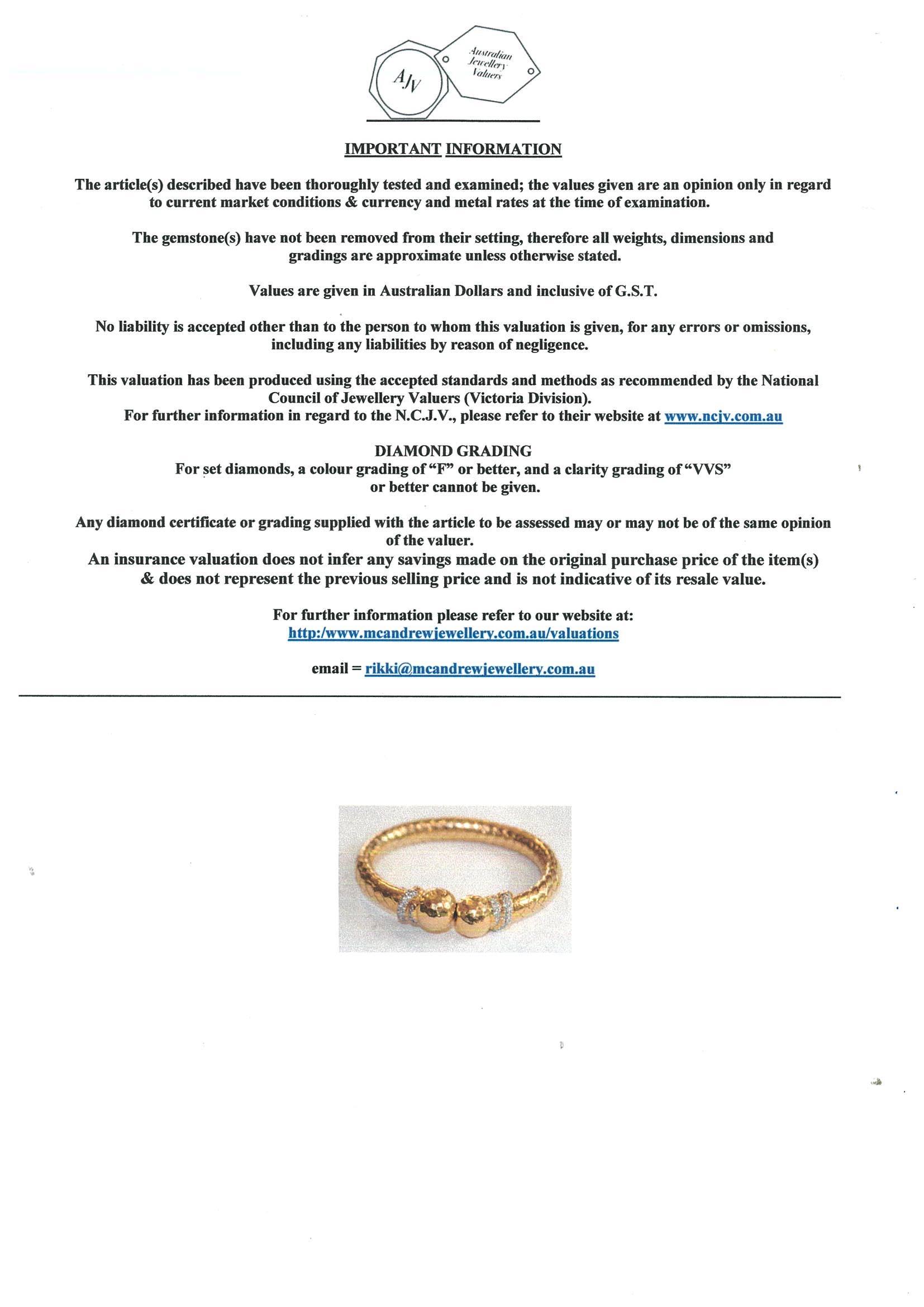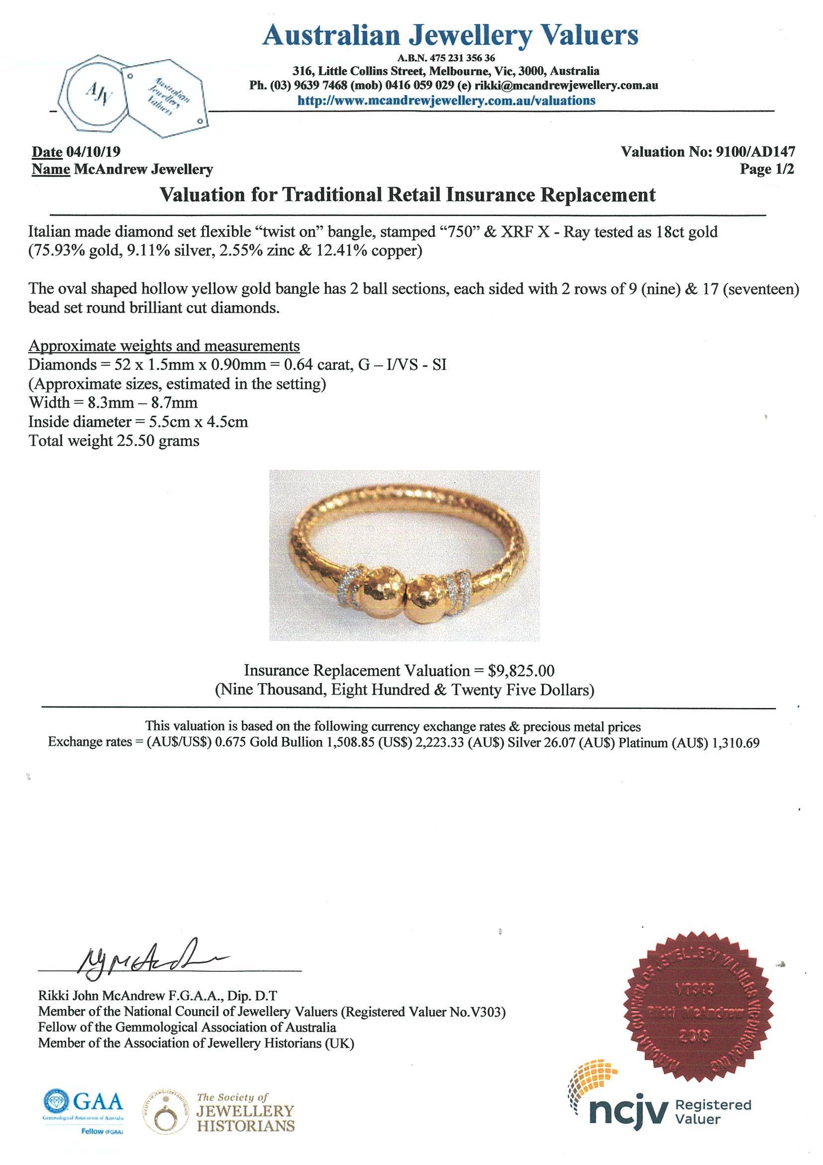 Diamond bangle with 52 round Diamonds totalling approximately 0.64cts (Estimated grading G-I VS-SI), 18ct yellow gold. Circumference 14-17cm expendable. Weight 25.5g. With Valuation #9100/AD147. (Pre-owned)