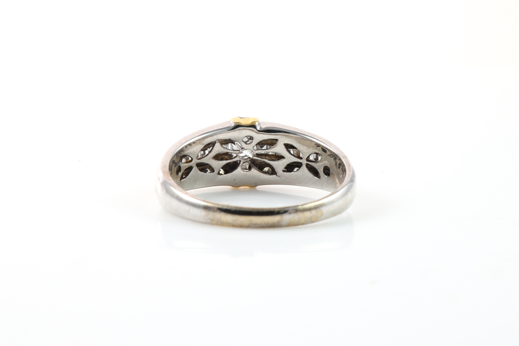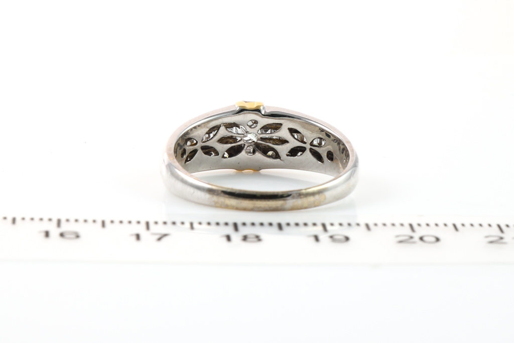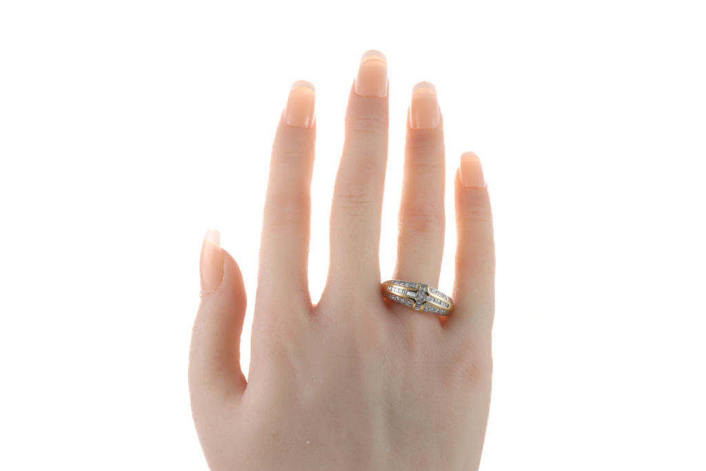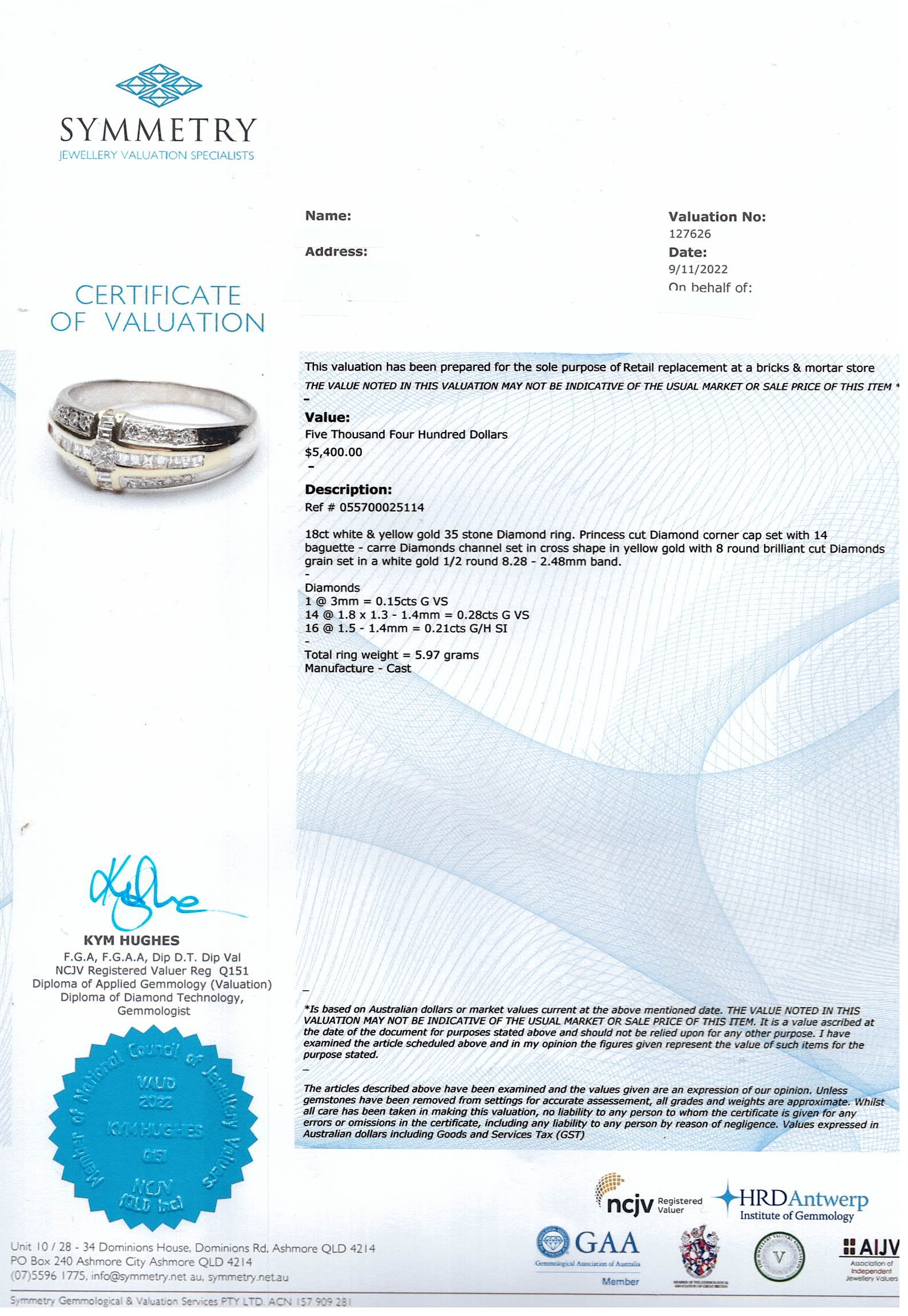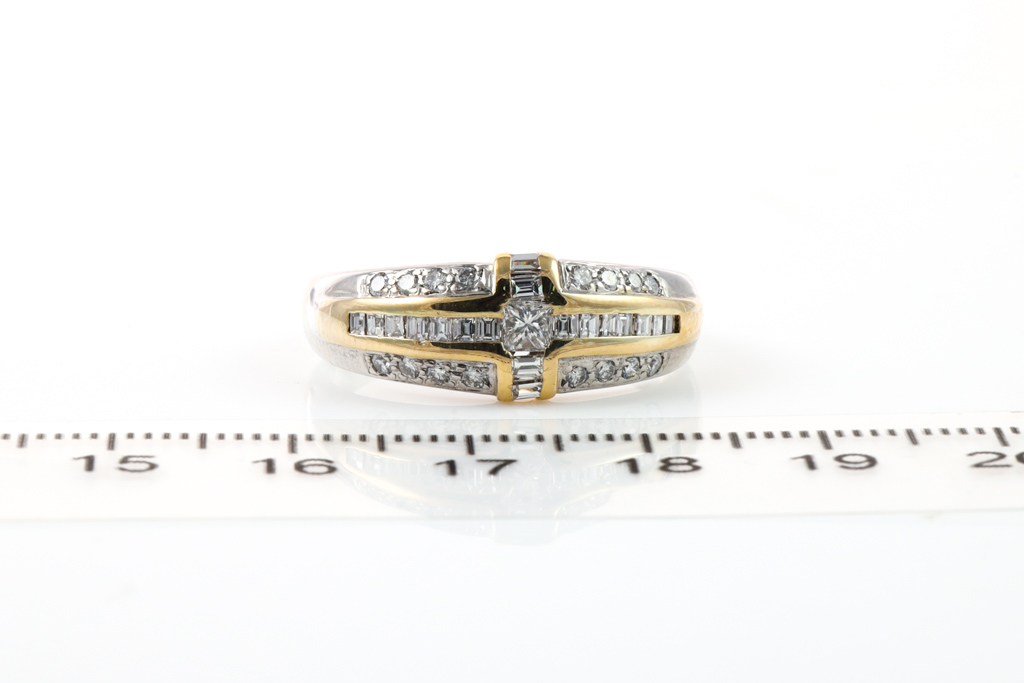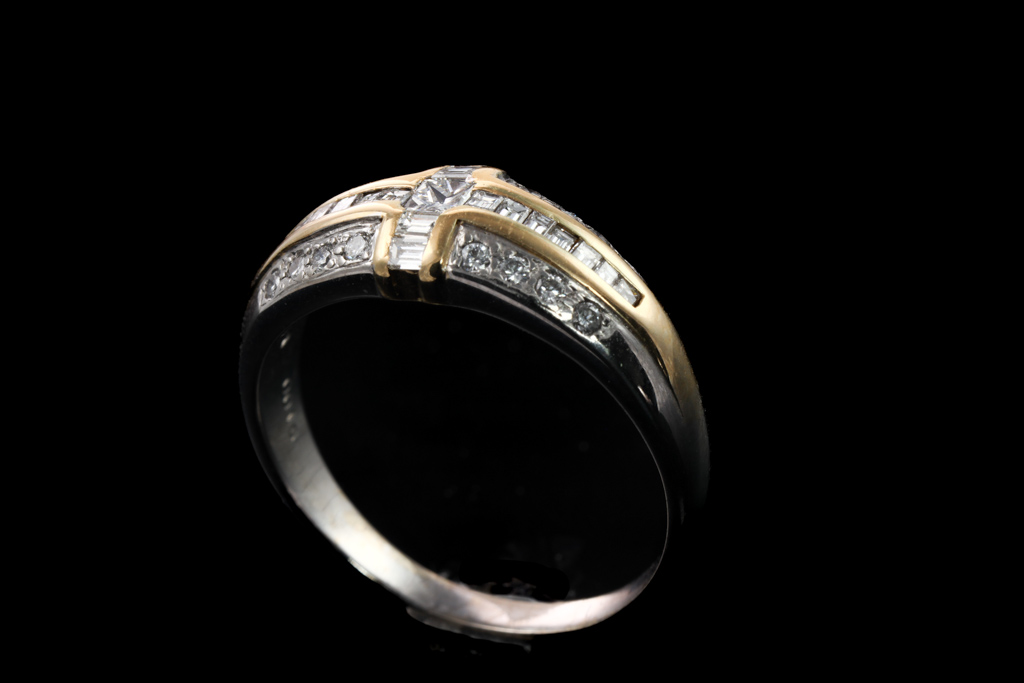 Diamond Dress ring with princess and baguette cut Diamonds of 0.64ct (Estimated grading: G VS). 18ct yellow and white gold. Ring size U. Weight: 6g. With Valuation Certificate #0055700025114. (Pre-owned)
