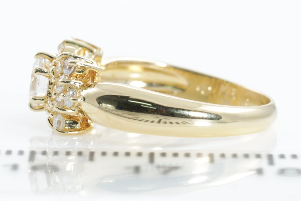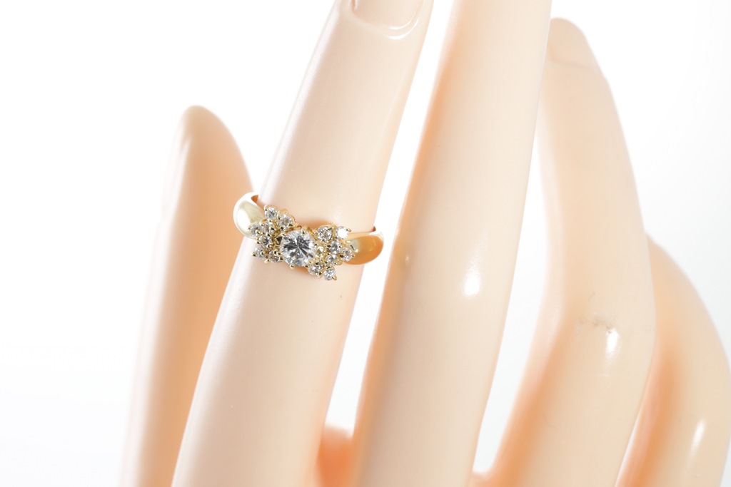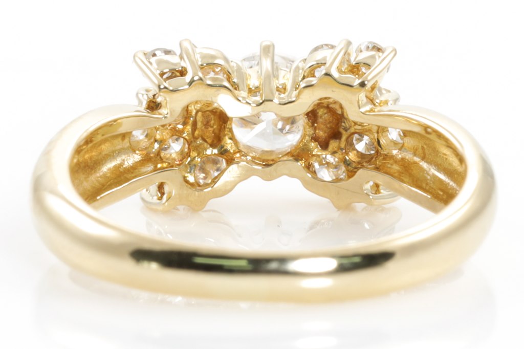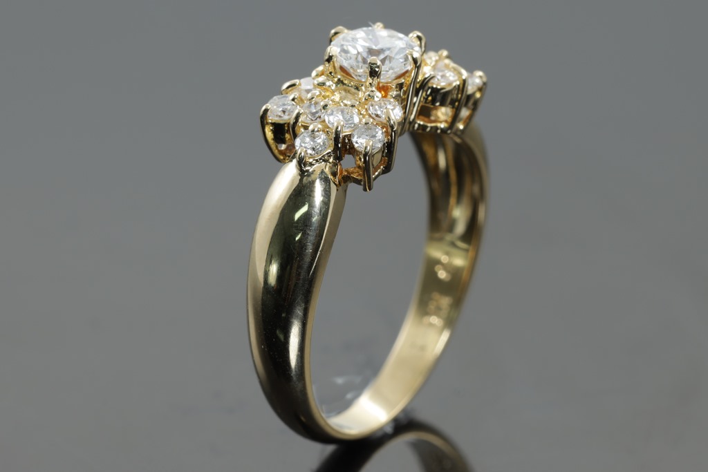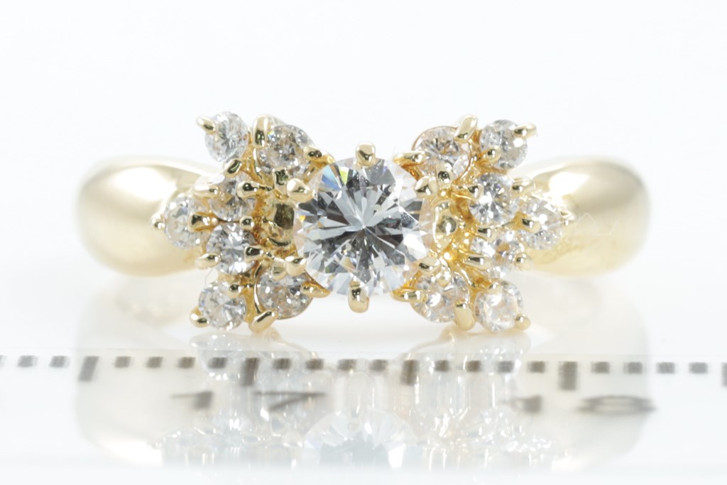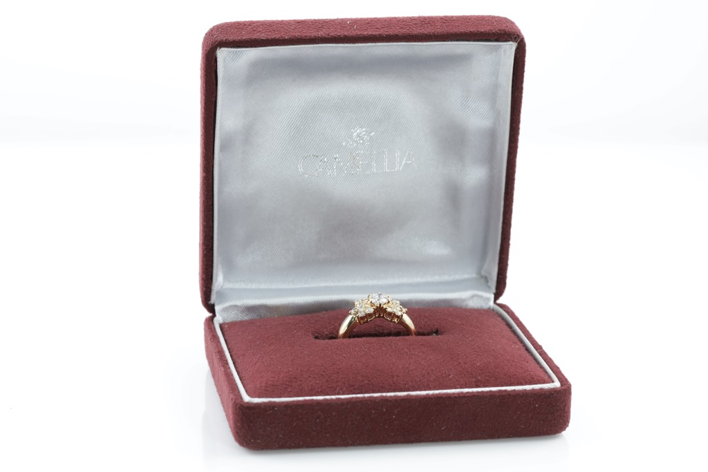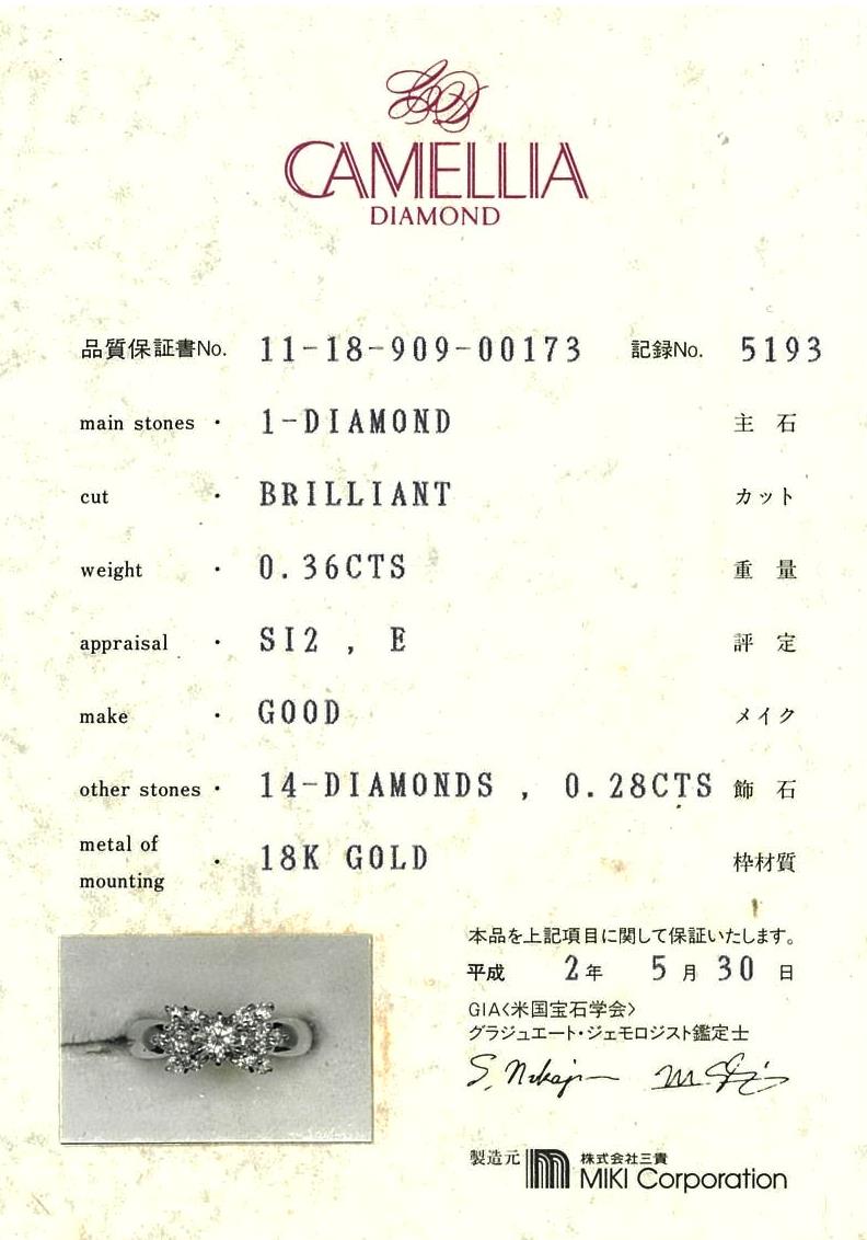 Diamond ring with a centre round brilliant cut Diamond of 0.36ct (With Camellia Diamond certificate graded as E SI2) and remaining Diamonds totalling 0.28cts. 18ct yellow gold. Ring size: I1/2 - ring resizing is not recommended. Weight: 3.4g. With Camellia box. (Pre-owned)