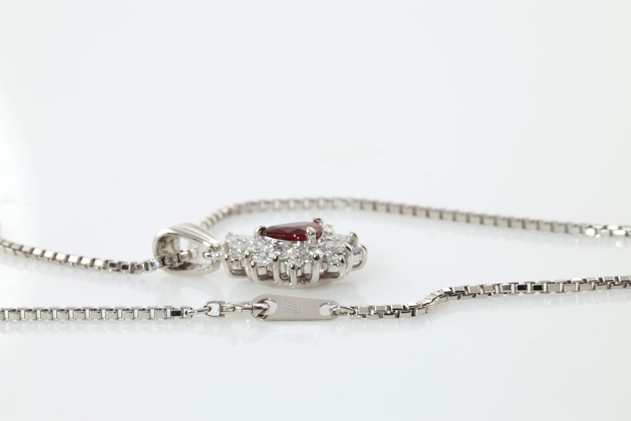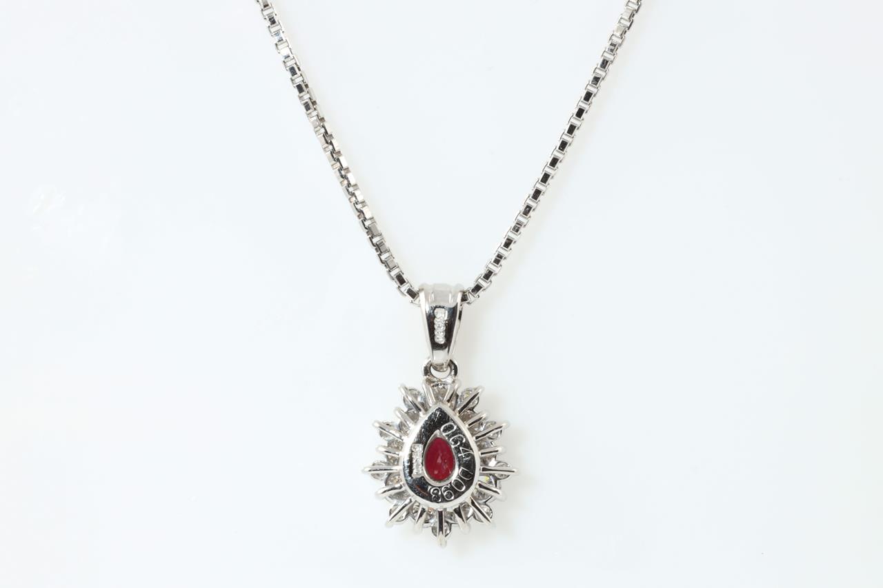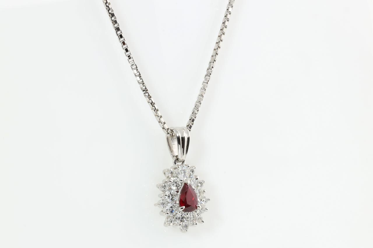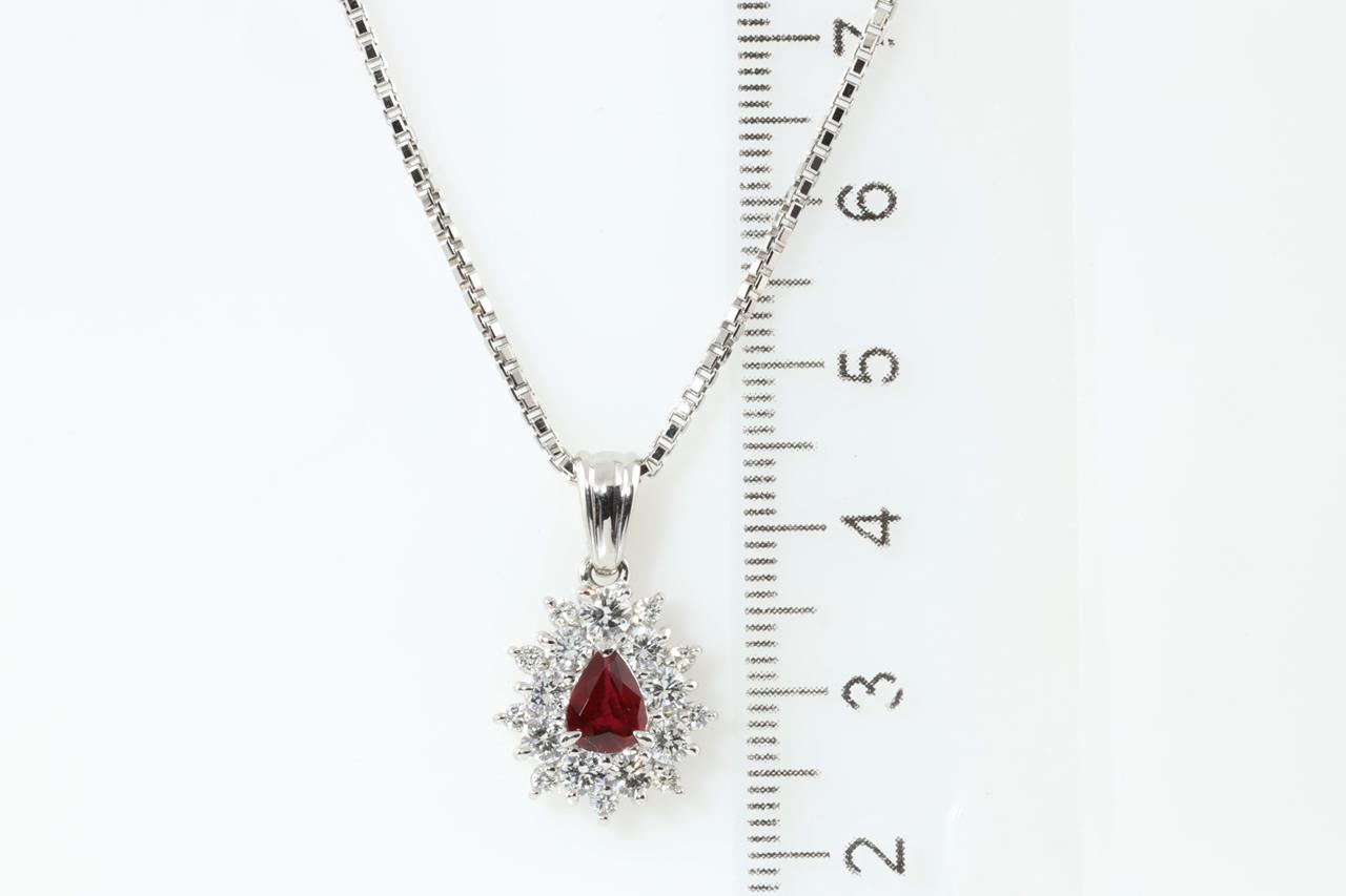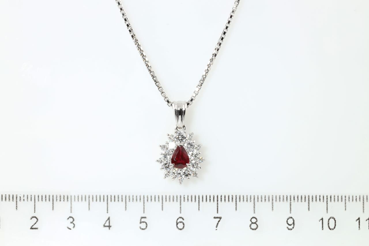 Ruby and Diamond pendant with pear shape Ruby of 0.64ct and Diamonds totalling 0.98cts (Estimated grading: G VS). Platinum with platinum 40cm chain. Weight: 11.0g (Pre-owned)
