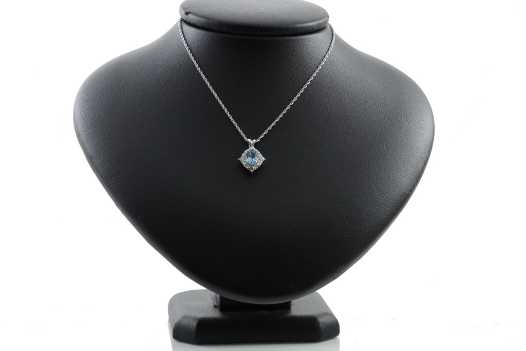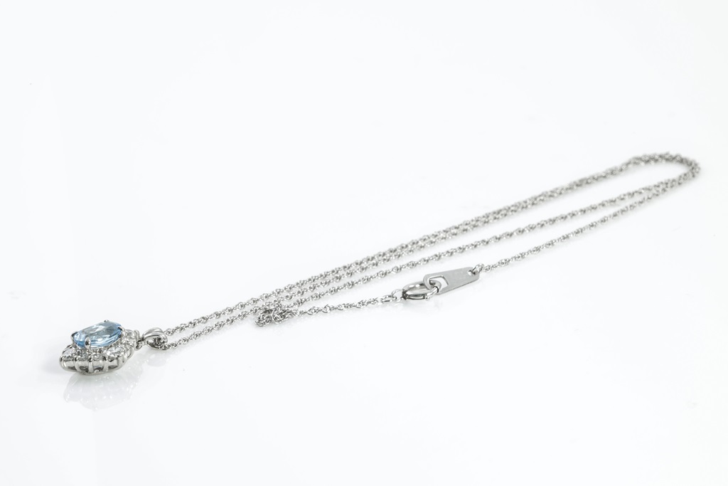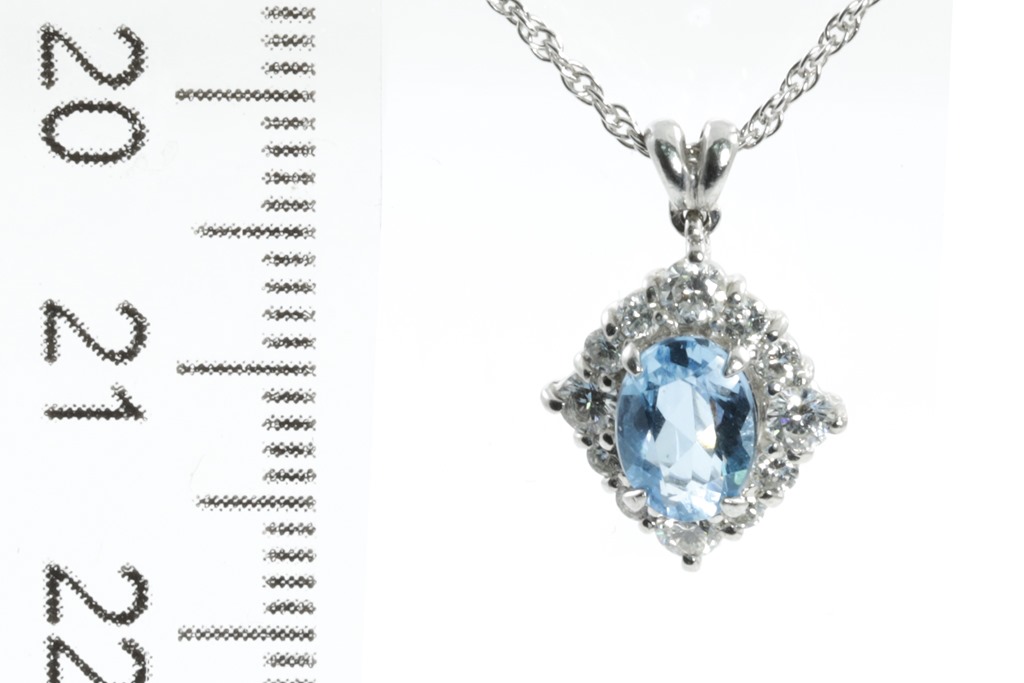 Aquamarine and Diamond pendant with an oval shape Aquamarine of 0.65ct and Diamonds totalling 0.36cts (Estimated grading: H SI). Platinum with 41cm chain. Weight: 4.3g (Pre-owned)