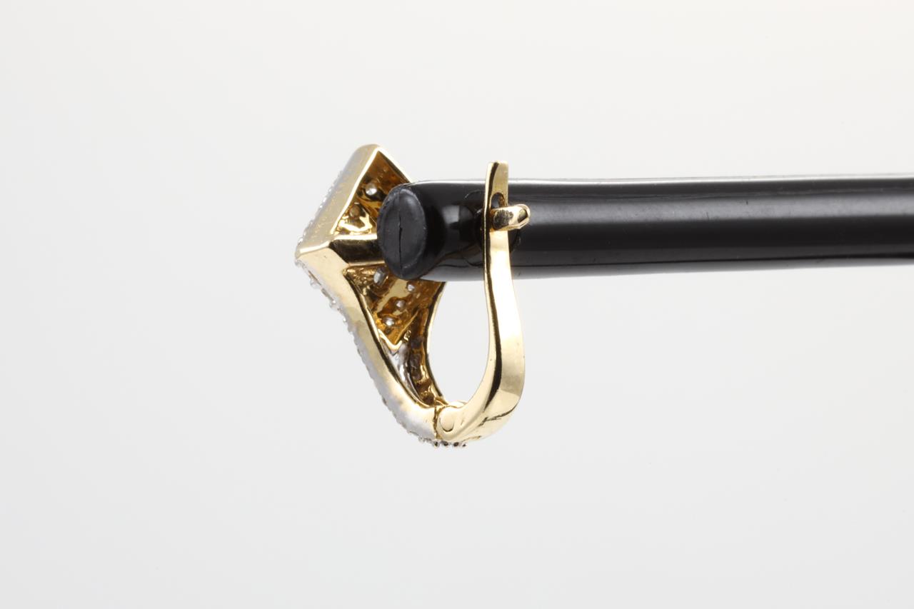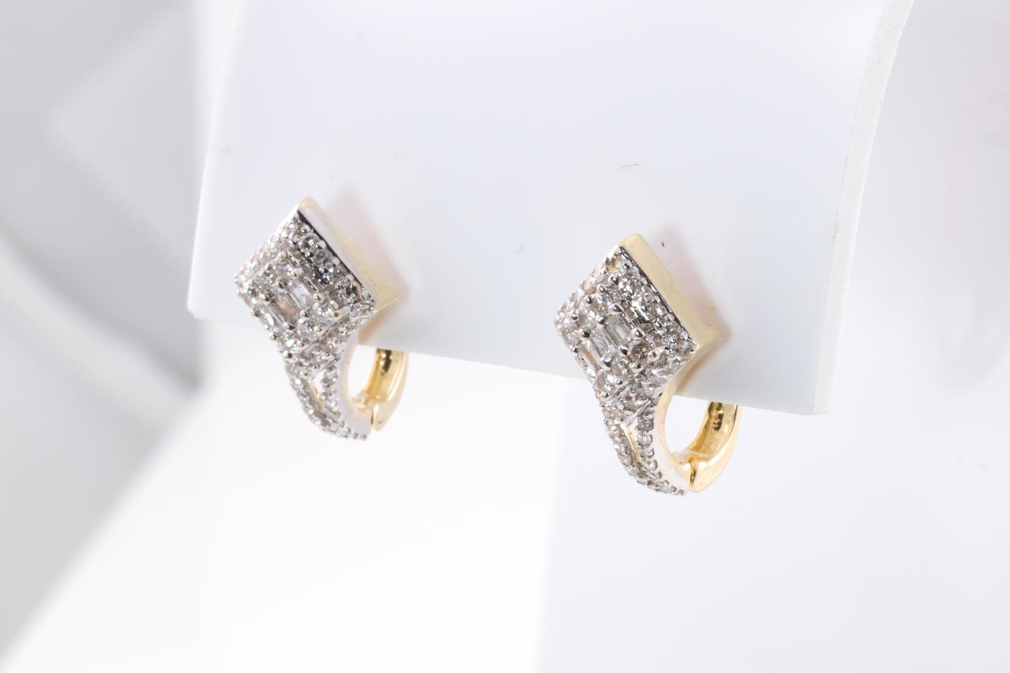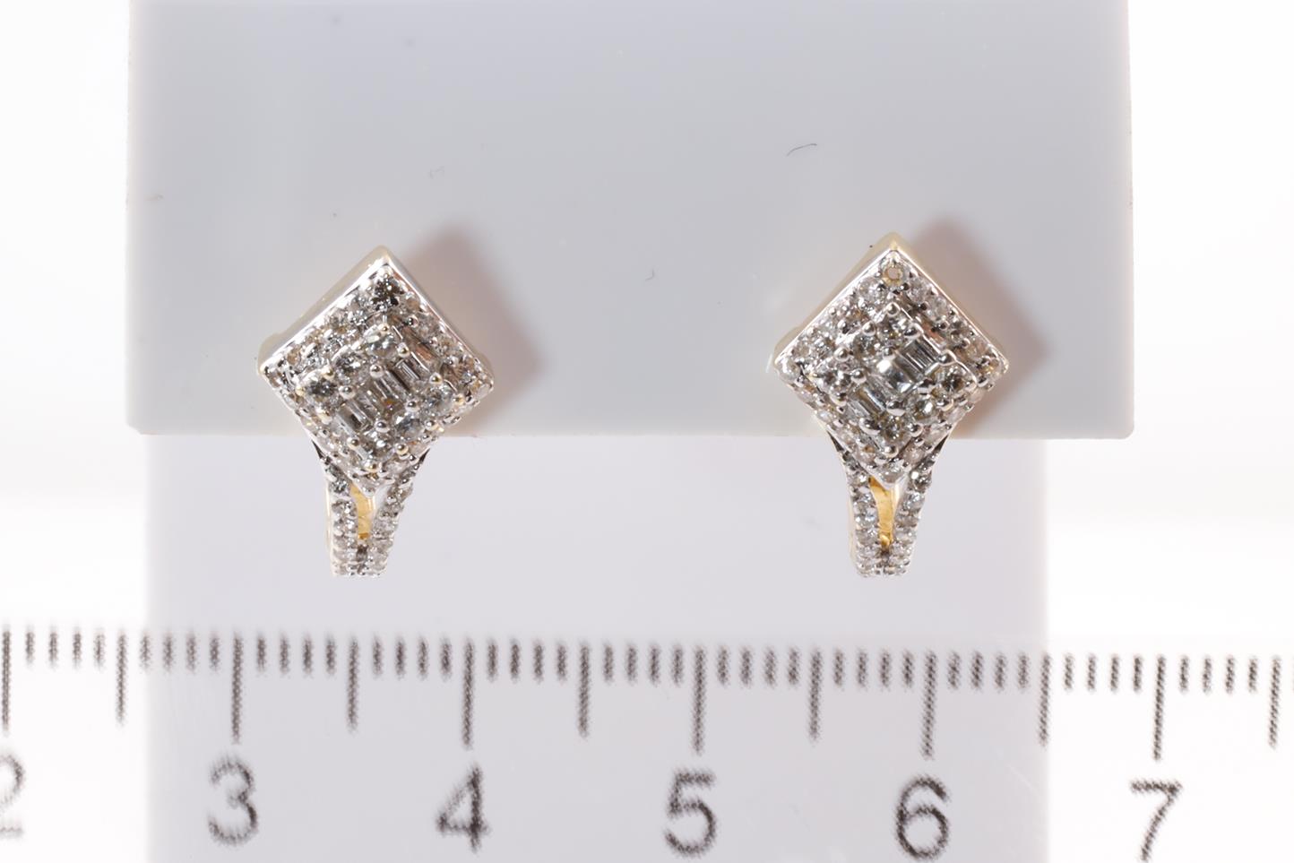Diamond Earrings with round Diamonds totalling 0.58cts and baguette cut Diamonds totalling 0.07cts (Estimated grading: H P1). 14ct white and yellow gold. Weight: 3.4g. (Pre-owned)