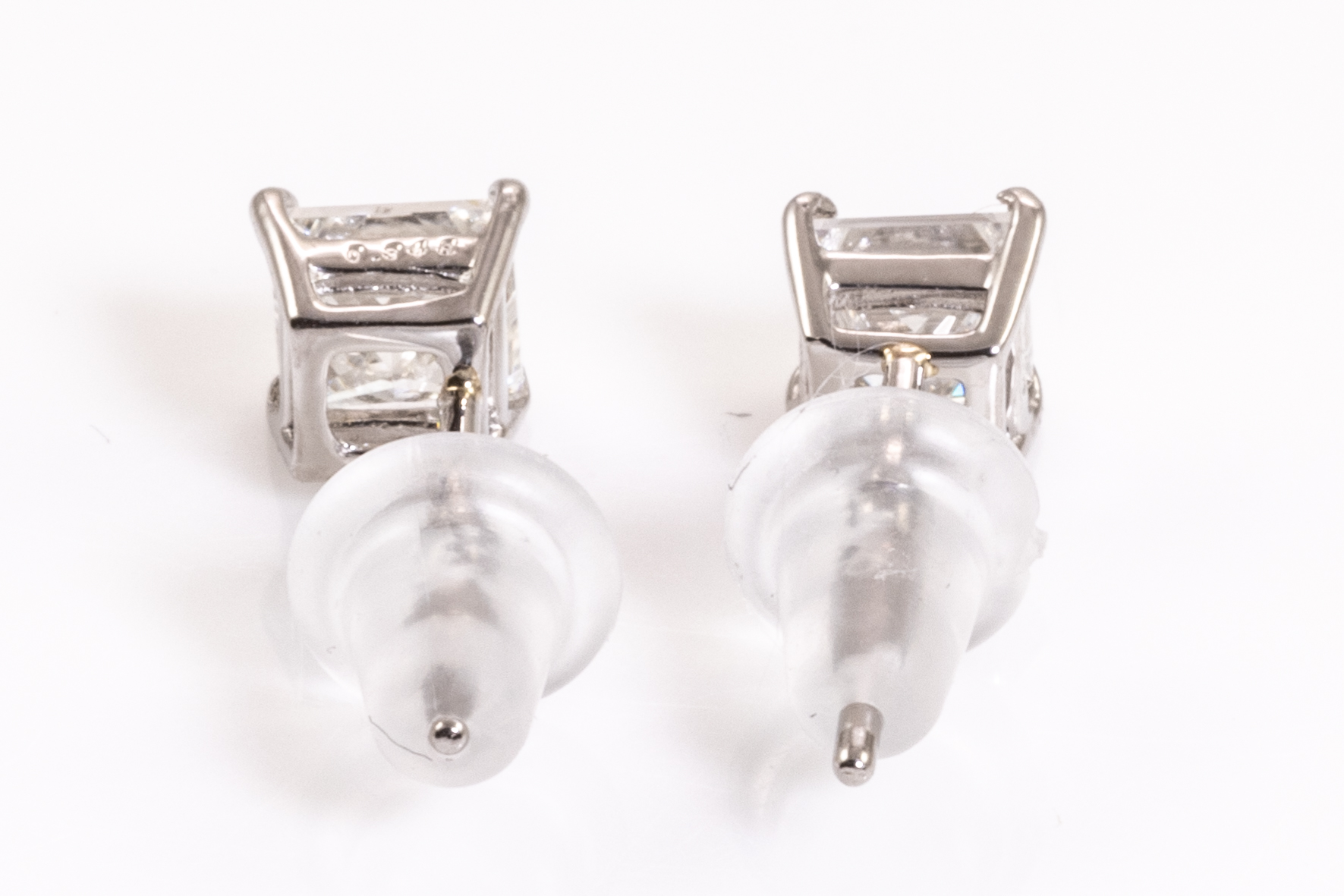 Diamond stud earrings with princess cut Diamonds totalling 0.65cts (Estimated grading: I SI). Platinum with silicon backs. Weight: 0.7g. (Pre-owned)
