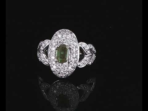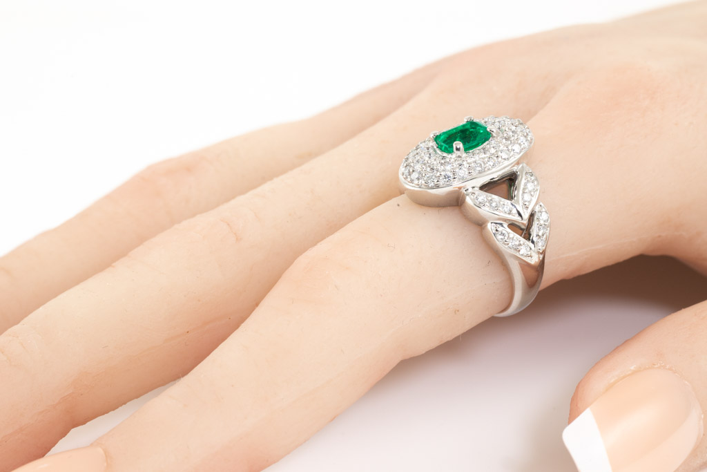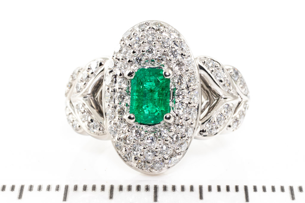 Emerald and Diamond ring with emerald cut Emerald of 0.66ct and round Diamonds totalling 0.83cts (Estimated grading: G SI). Platinum. Ring size L1/2. Weight: 13.6g. (Pre-owned)