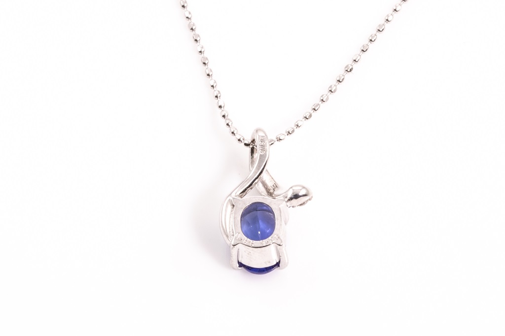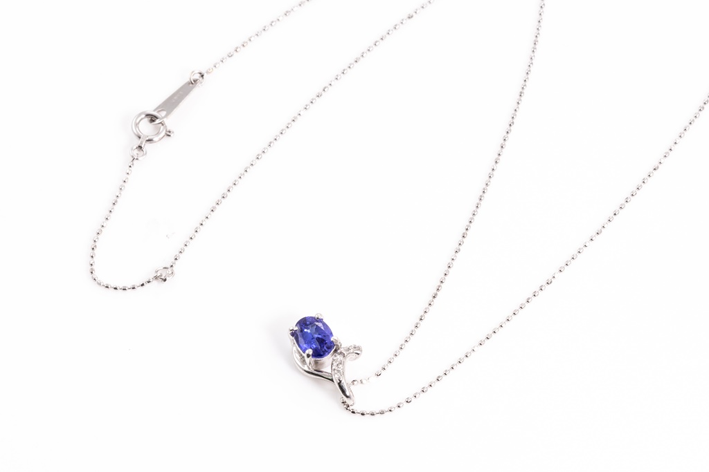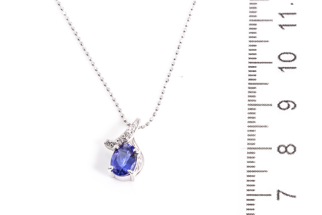 Tanzanite and Diamond pendant with an oval shape Tanzanite of 0.66ct and 5 round Diamonds totalling 0.05cts. 18ct white gold with adjustable 42cm 18ct white gold chain. Weight: 3g. (Pre-owned)