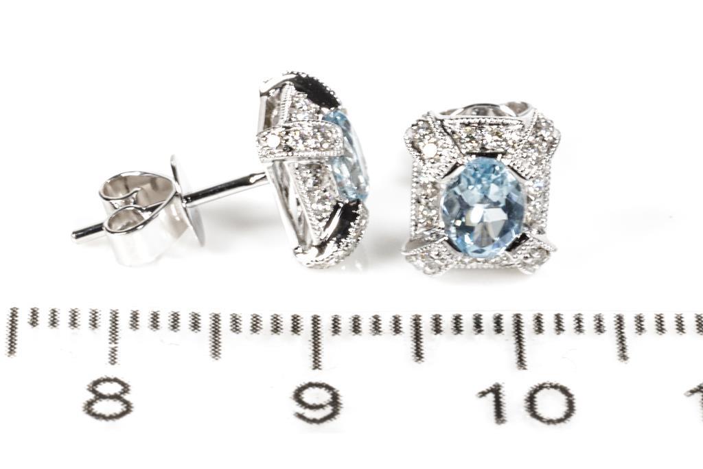 Aquamarine and Diamond earrings with oval Aquamarine totalling 0.67cts and round Diamond totalling 0.25cts. 14ct white gold. Weight: 2.3g. (New)