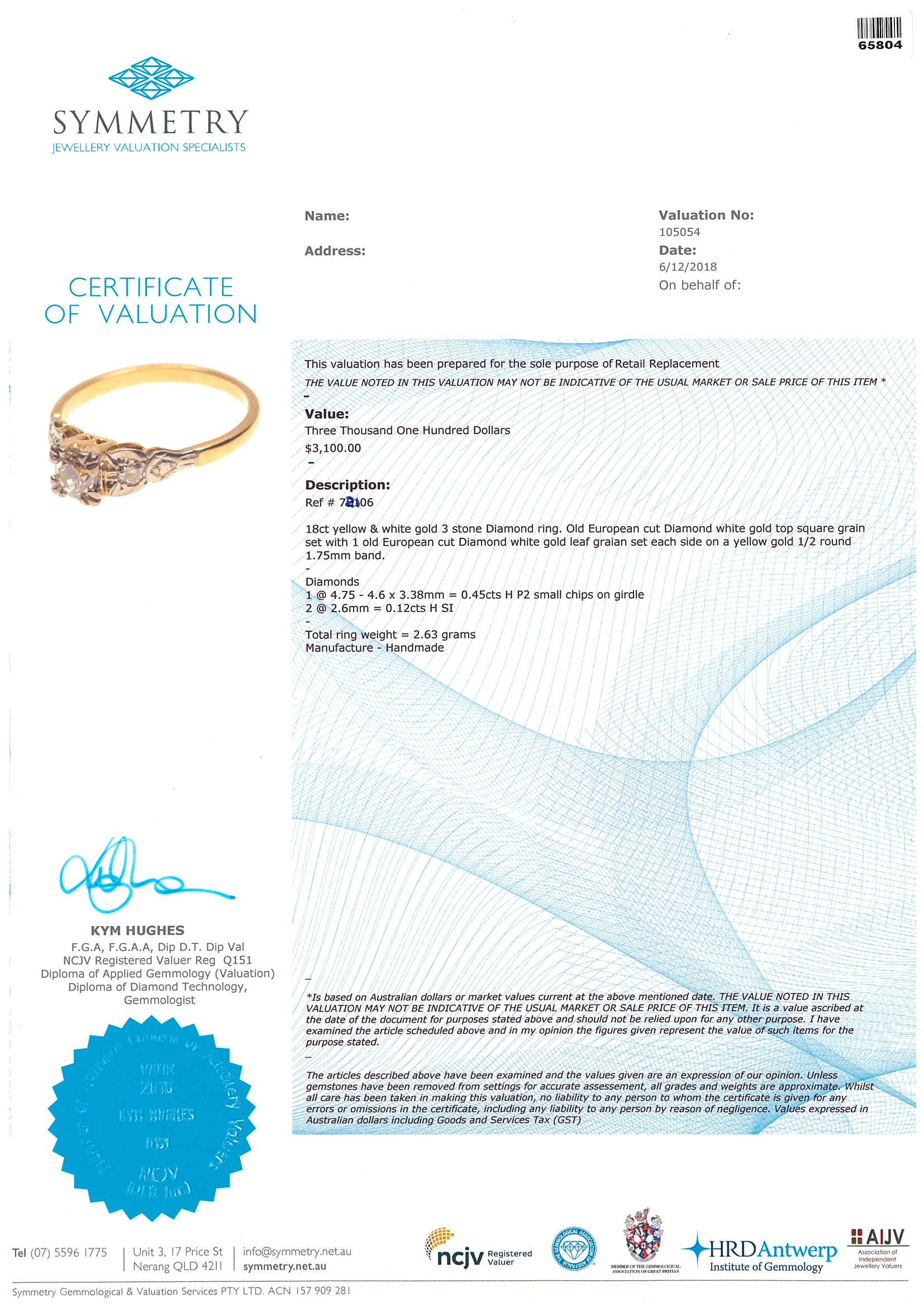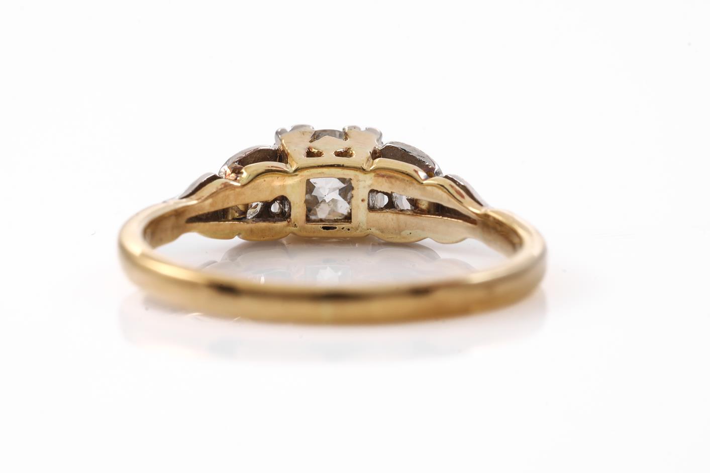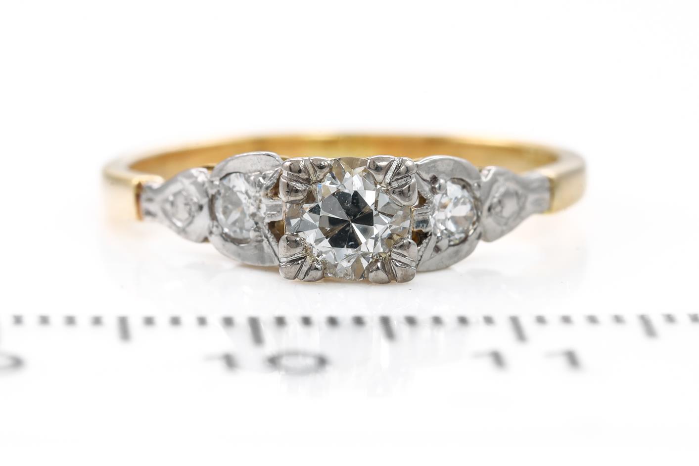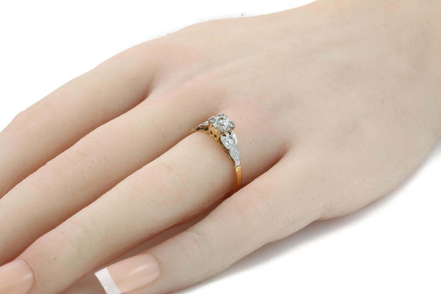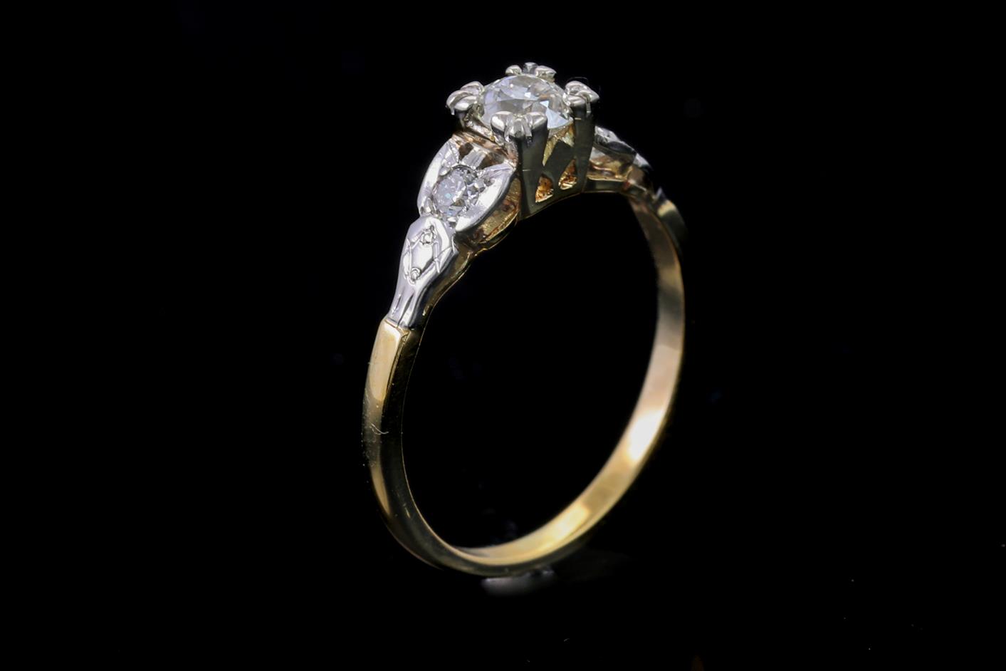 Diamond ring with centre round cut Diamond totalling approximately 0.45cts (Estimated grading H P2 - chipped on girdle) and round Diamonds totalling 0.12cts. 18ct yellow and white gold. Ring size N 1/2. With valuation. Weight 2.6g (Pre-owned)