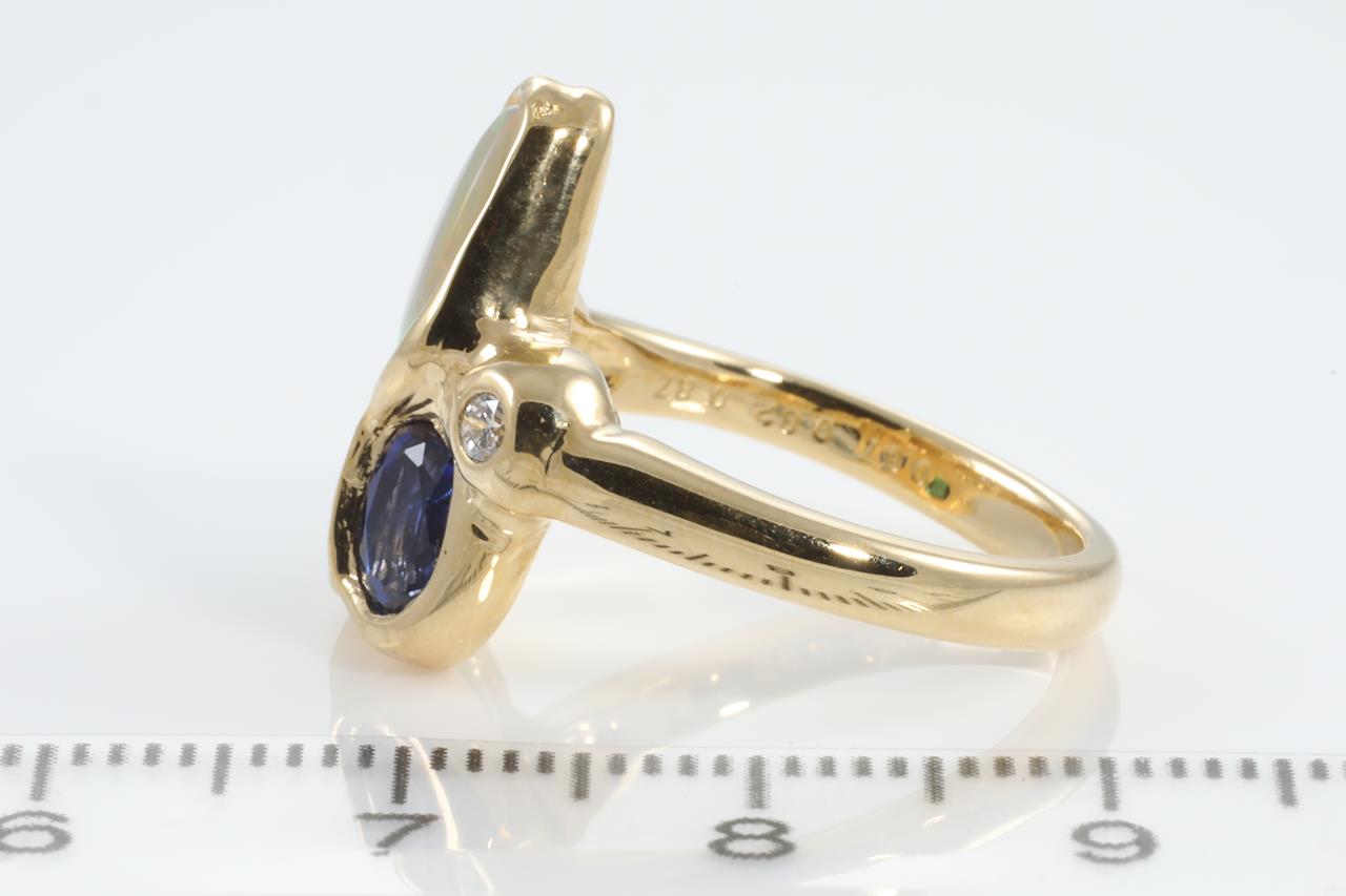 Opal, Sapphire, Tourmaline and Diamond ring with pear shape Opal of 0.67ct, Blue Sapphire of 0.82ct, green Tourmaline of 0.87ct and Diamonds totalling 0.11cts. 18ct yellow gold. Ring size M - Ring resizing is not recommended. Weight: 8.7g (Pre-owned)