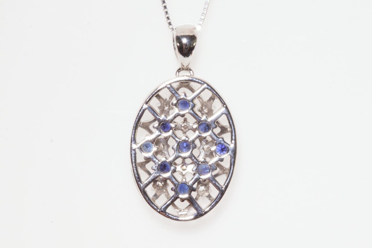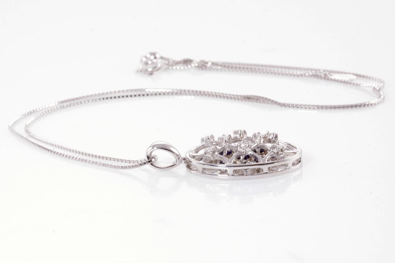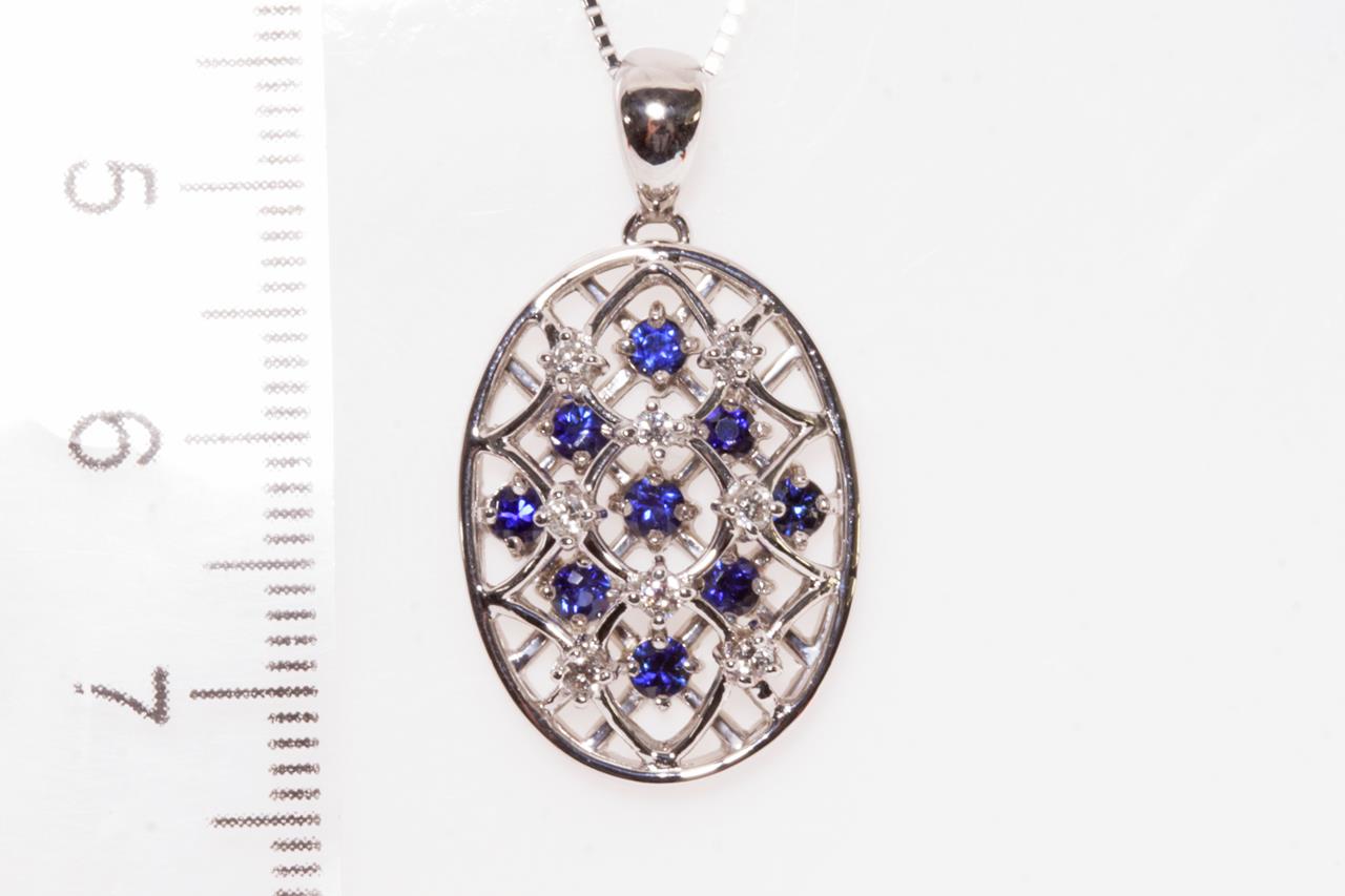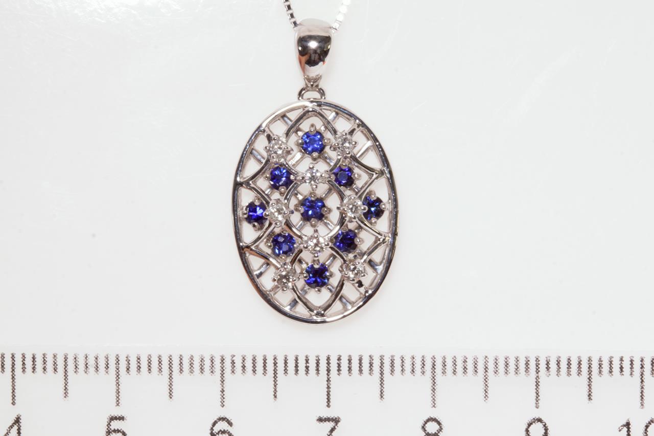Sapphire and Diamond pendant with round Sapphires totalling 0.67cts and round Diamonds totalling 0.15cts. 18ct white gold with 18ct gold adjustable 45cm chain. Weight: 6.6g (Pre-owned)