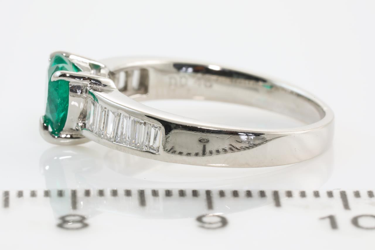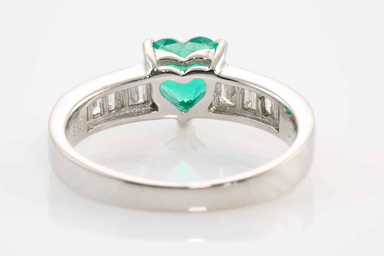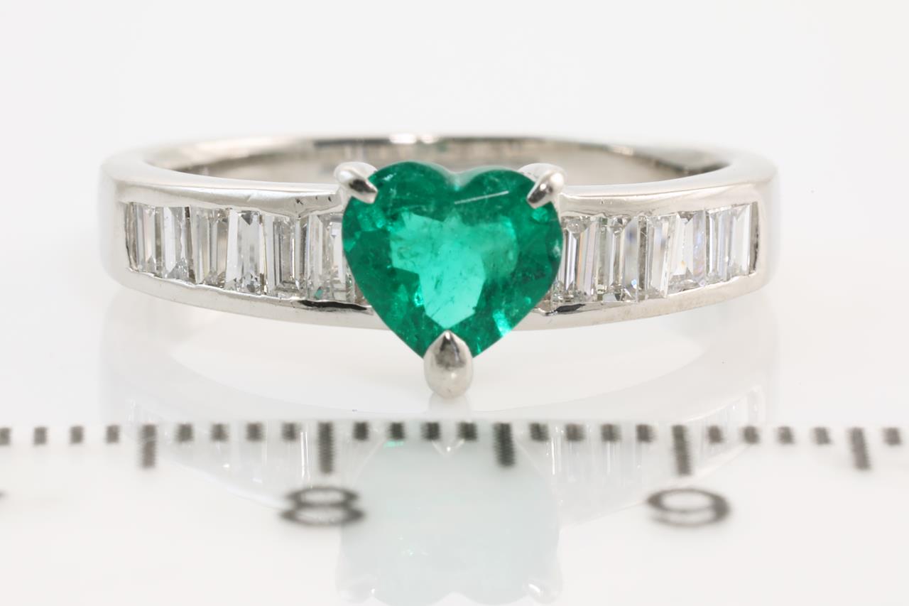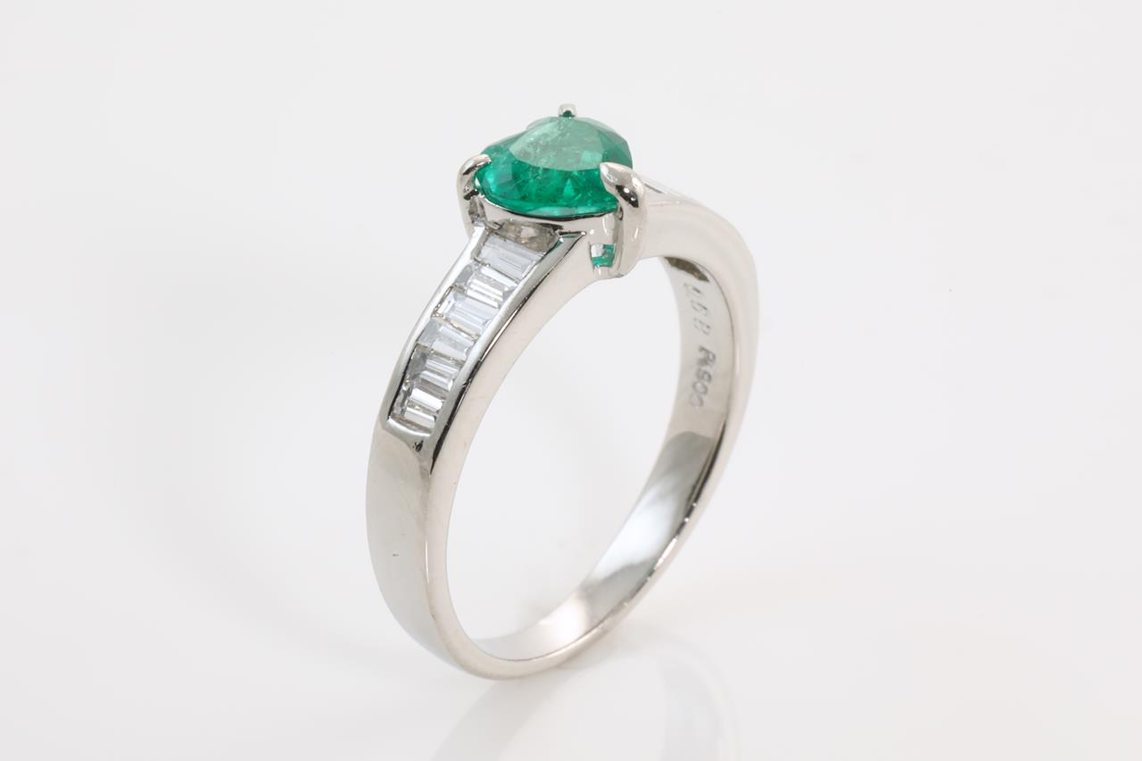 Emerald and Diamond ring with heart shape Emerald of 0.68ct and Diamonds totalling 0.40cts (Estimated grading: G VS-SI). Platinum. Ring size: L1/2 - ring resizing up is not recommended, can only be resized down with ring clip. Weight: 4.9g (Pre-owned)