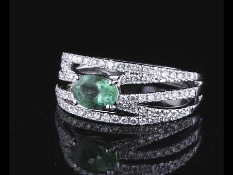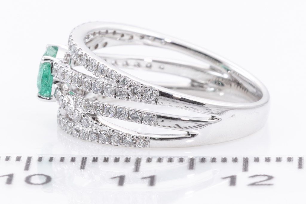 Emerald and Diamond Ring with oval cut Emerald of 0.68ct and round Diamonds totalling approximately 0.52ct (Estimated grading: H SI2). 18ct white gold. Ring size N. Weight 4.6g. (As New)