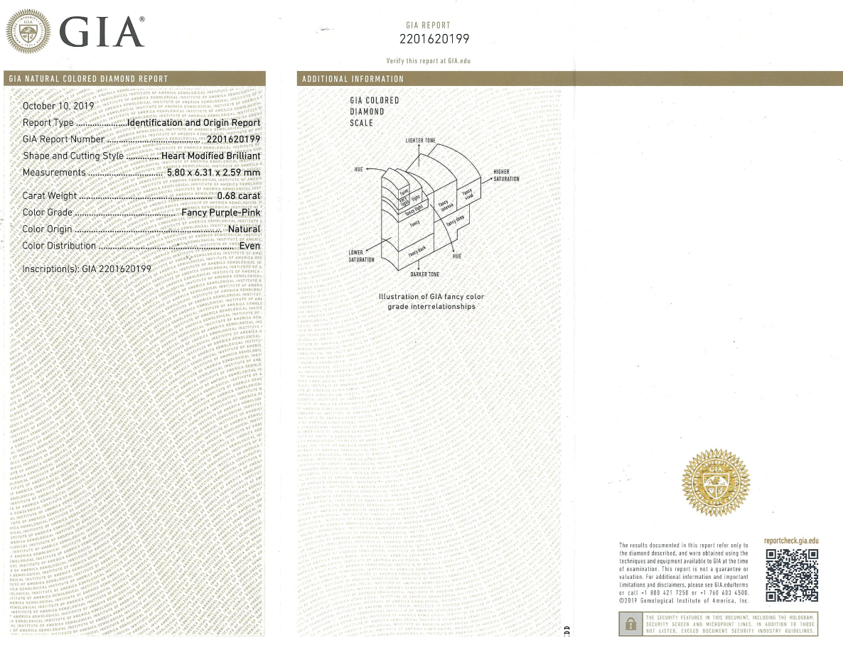 A loose heart shape Diamond of 0.68ct (With GIA report graded as Natural Fancy Purple-Pink Even #2201620199). (As new)