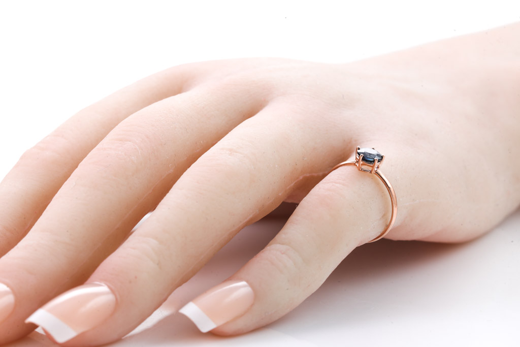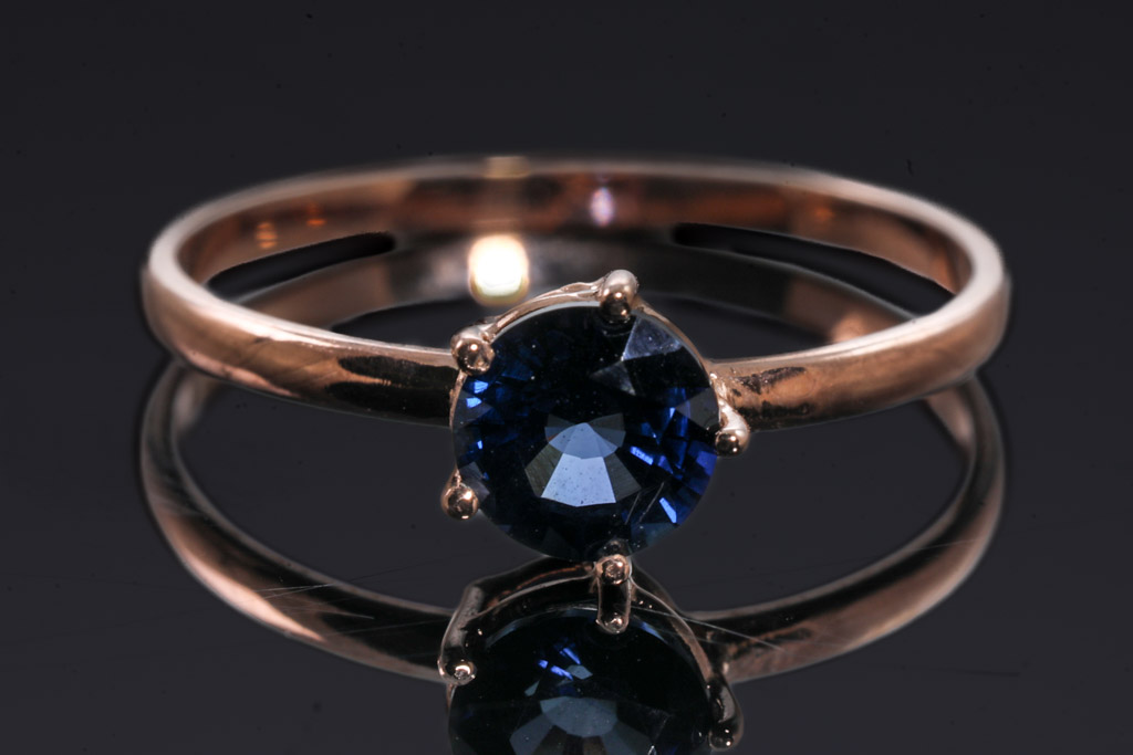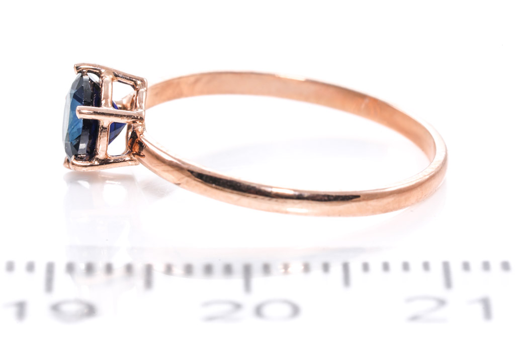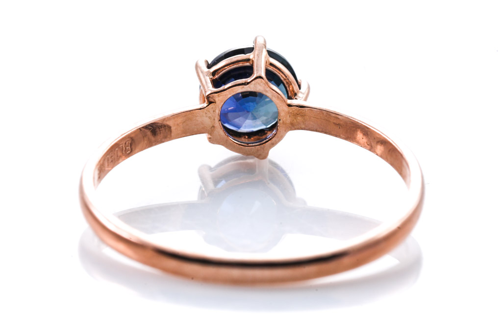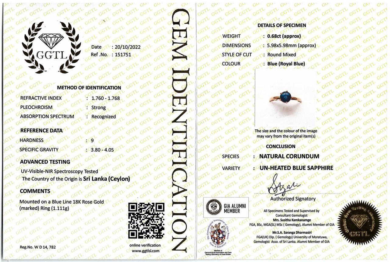 Ceylon Sapphire Ring with round cut Royal blue unheated Sapphire of 0.68ct (with Gem report). 18ct rose gold. Ring size I 1/2. Weight 1.1g. (As New)
