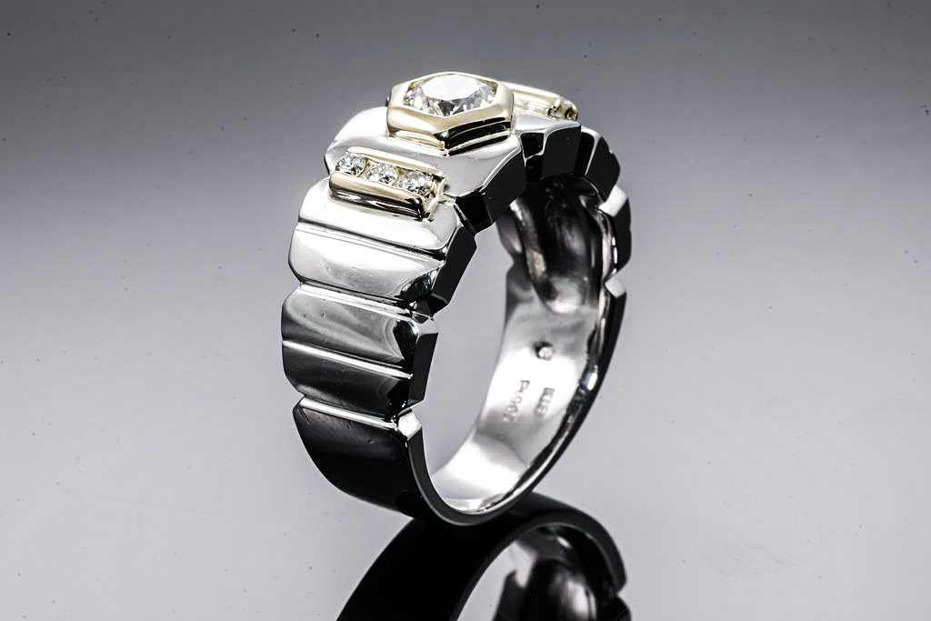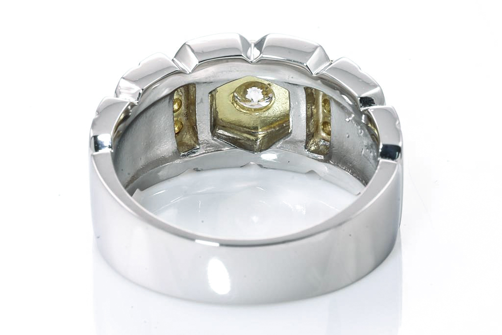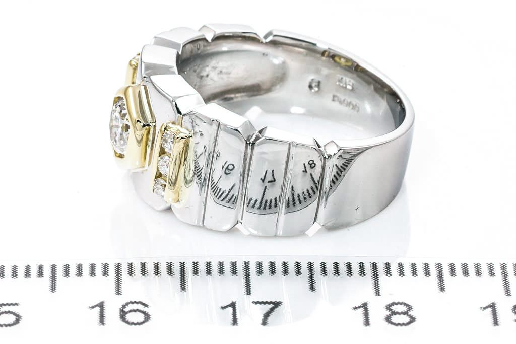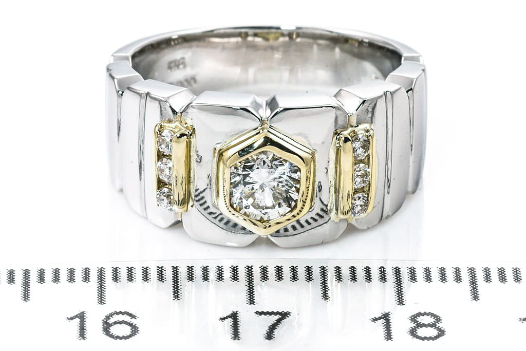 Mens ring with round Diamonds totalling 0.69cts (Estimated grading: H-I P1). 18ct yellow gold and platinum. Ring size P - ring resizing is not recommended. Weight: 17.8g. (Pre-owned)