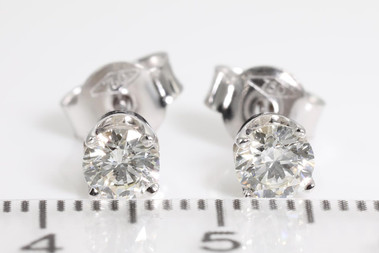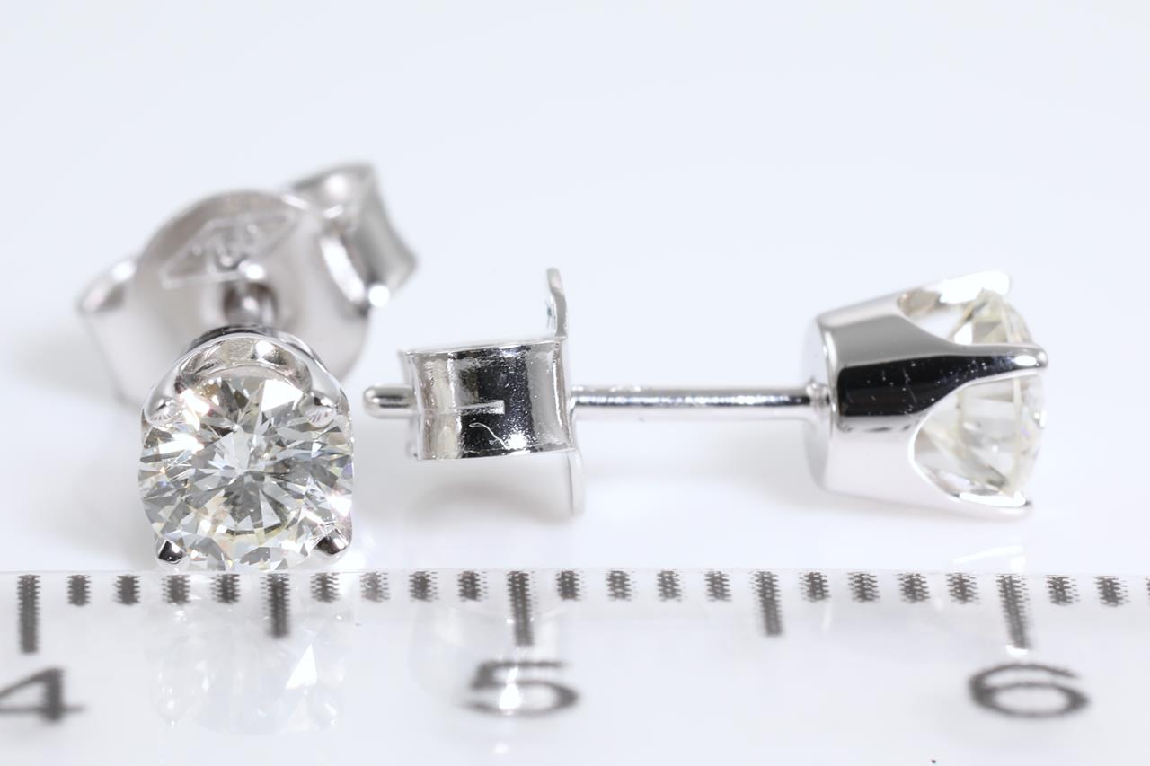 Diamond stud earrings with 2 round brilliant cut Diamonds totalling 0.69cts (Estimated grading: I-J VS). 18ct white gold. Weight: 1.5g. (New).