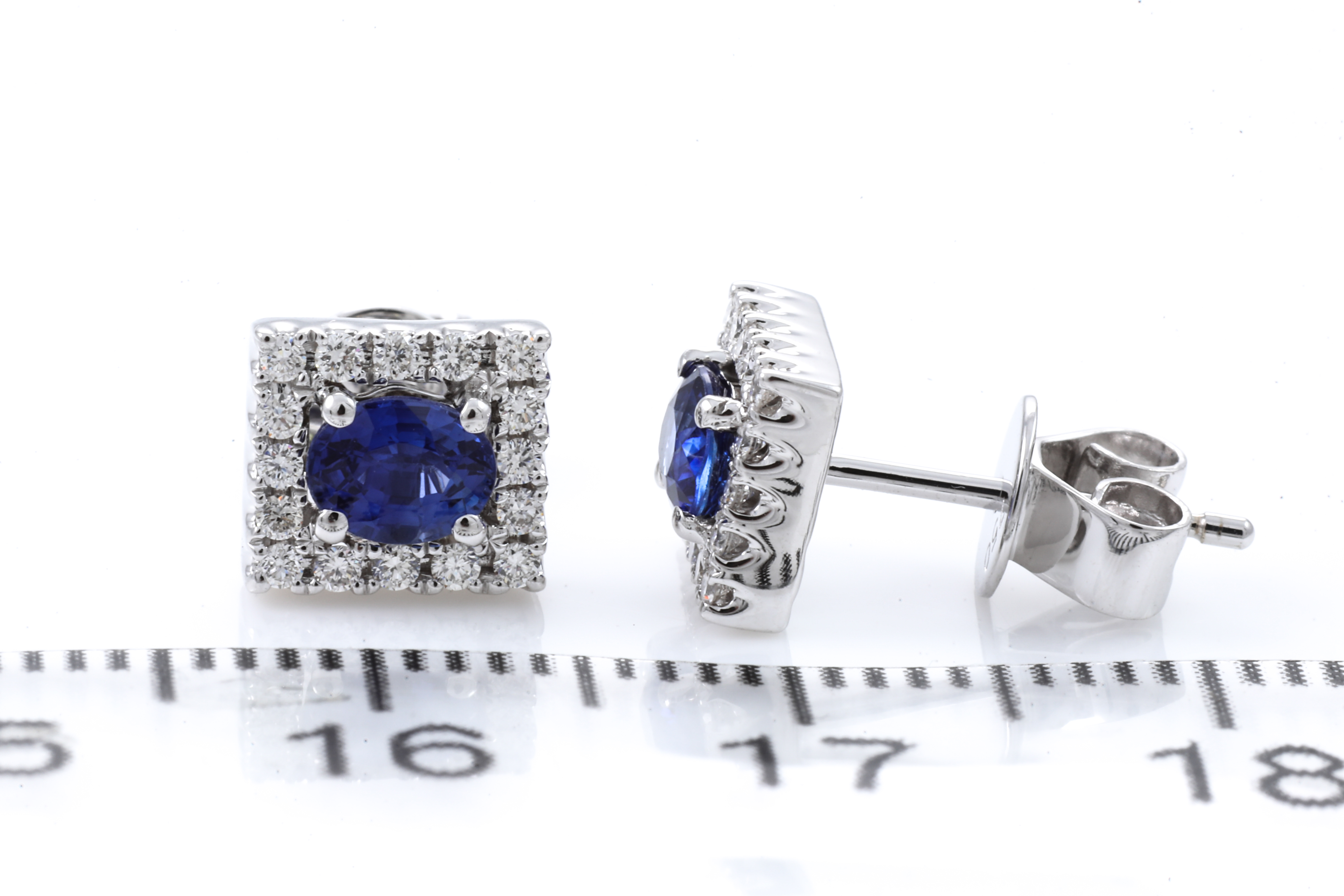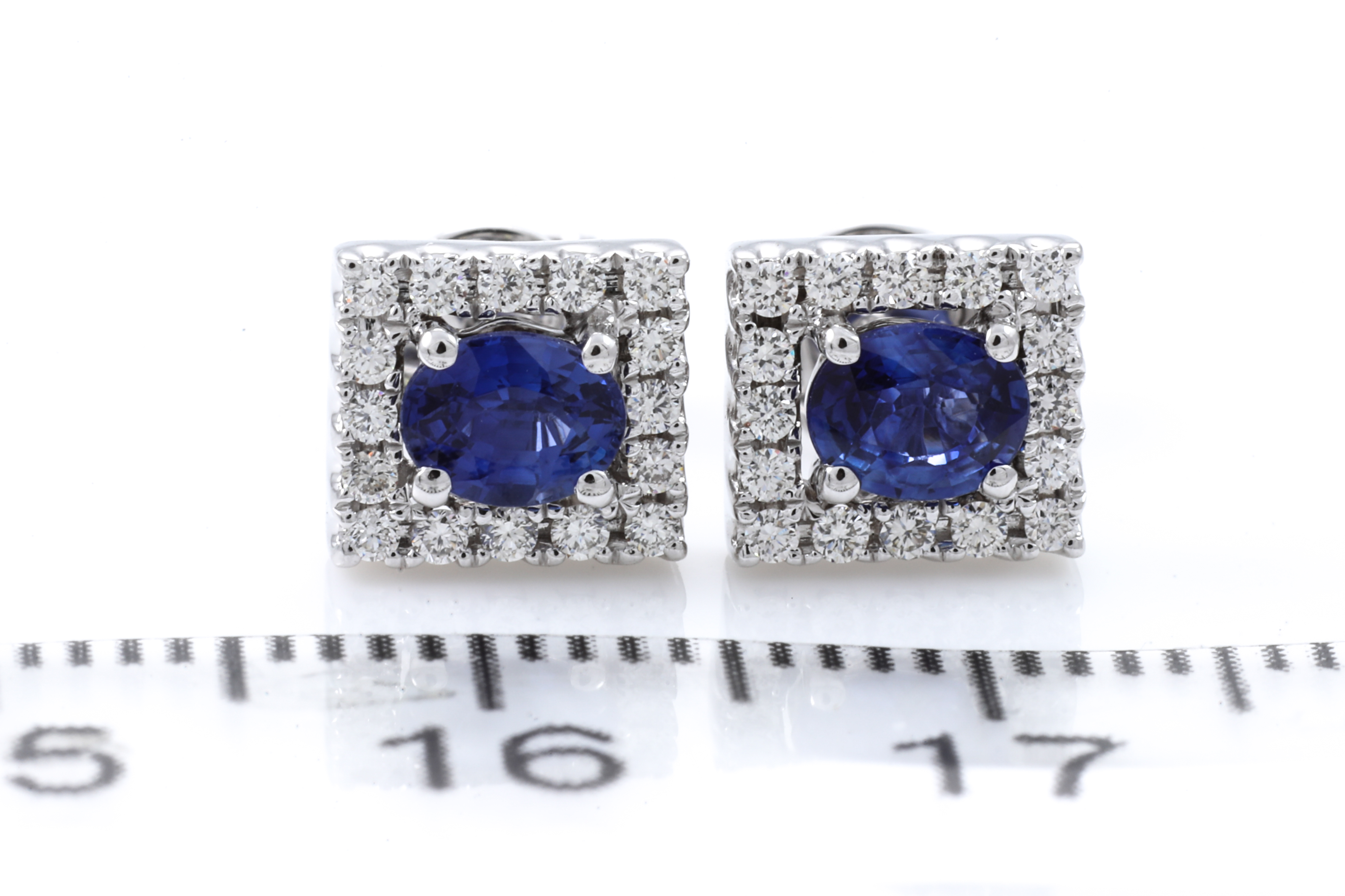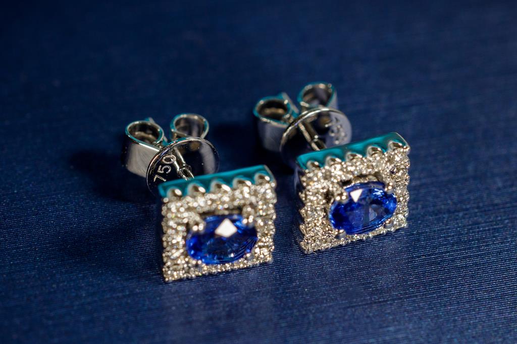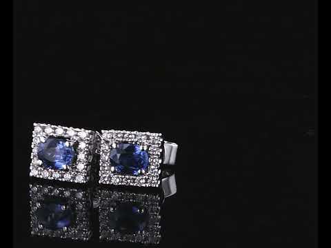 Sapphire and Diamond earrings with oval blue Sapphires totalling 0.69cts and round Diamonds totalling 0.21cts. 18ct white gold. Weight: 2.6g. (New)